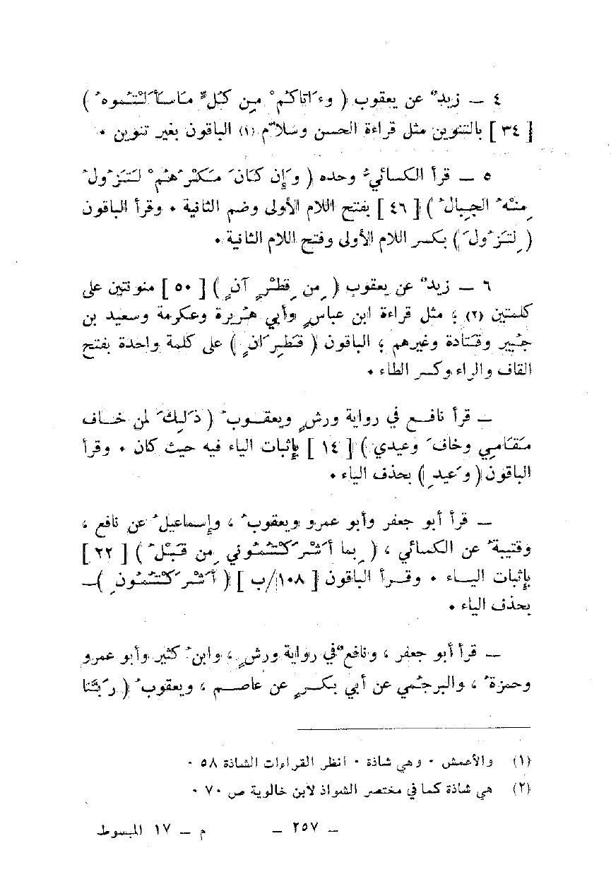 6 - زيد عن يعقوب {مِنْ قَطِرَانٍ} [50] منونتين على كلمتين؛ مثل قراءة ابن عباس وأبي هريرة وعكرمة وسعيد بن جبير وقتادة وغيرهم؛ الباقون {قَطِرَانٍ} على كلمة واحدة بفتح القاف والراء وكسر الطاء.
