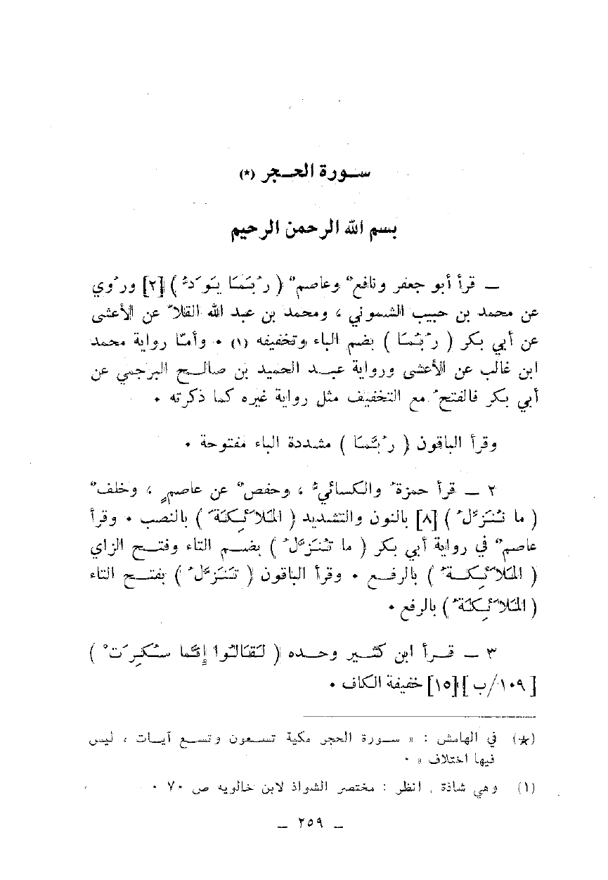 - قرأ أبو جعفر ونافع وعاصم {رُبَمَا يَوَدُّ} [2] وروي عن محمد بن حبيب الشموني، ومحمد بن عبد الله القلا عن الأعشى عن أبي بكر {رُبَمَا} بضم الباء وتخفيفه. وأما رواية محمد ابن غالب عن الأعشى ورواية عبد الحميد بن صالح البرجمي عن أبي بكر فالفتح مع التخفيف مثل رواية غيره كما ذكرته.