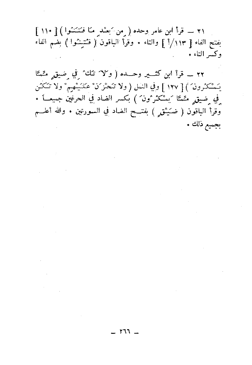 21 - قرأ ابن عامر وحده {مِنْ بَعْدِ مَا فُتِنُوا} [110] بفتح الفاء والتاء. وقرأ الباقون {فُتِنُوا} بضم الفاء وكسر التاء.