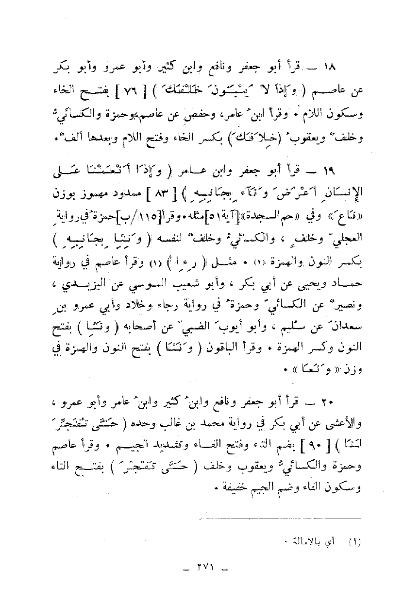 19 - قرأ أبو جعفر وابن عامر {وَإِذَا أَنْعَمْنَا عَلَى الْإِنْسَانِ أَعْرَضَ وَنَأَى بِجَانِبِهِ} [83] ممدود مهموز بوزن "ناع" وفي "حم السجدة" [آية 51] مثله. وقرأ حمزة في رواية العجلي وخلف، والكسائي وخلف لنفسه {وَنَأَى بِجَانِبِهِ} بكسر النون والهمزة. مثل {رءا} وقرأ عاصم في رواية حماد ويحيى عن أبي بكر، وأبو شعيب السوسي عن اليزيدي، ونصير عن الكسائي وحمزة في رواية رجاء وخلاد وأبي عمرو بن سعدان عن سليم، وأبو أيوب الضبي عن أصحابه {ونئا} بفتح النون وكسر الهمزة. وقرأ الباقون {ونئا} بفتح النون والهمزة في وزن "ونعا".