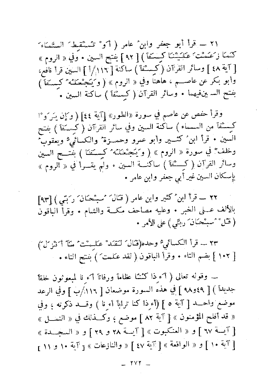 21 - قرأ أبو جعفر وابن عامر {أَوْ تُسْقِطَ السَّمَاءَ كَمَا زَعَمْتَ عَلَيْنَا كِسَفًا} [92] بفتح السين. وفي "الروم" [آية 48] وسائر القرآن {كِسَفًا} ساكنة السين قرأ نافع، وأبو بكر عن عاصم، هاهنا وفي "الروم" {وَيَجْعَلُهُ كِسَفًا} بفتح السين فيهما. وسائر القرآن {كِسْفً} ساكنة السين.