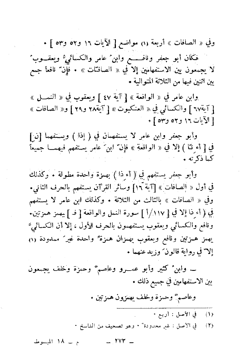 وأبو جعفر وابن عامر لا يستفهمان في {إِذَا} ويستفهما [ن] في {أَإِنَّا} إلا في "الواقعة" فإن ابن عامر يستفهم فيهما جميعا كما ذكرته.