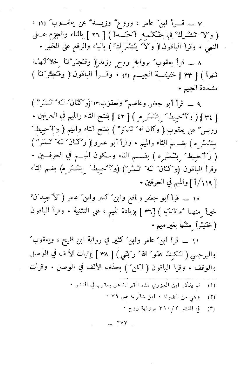 7 - قرأ ابن عامر، وروح وزيد عن يعقوب، {ثَلَاثَ مِائَةٍ سِنِينَا} [26] بالتاء والجزم على النهي. وقرأ الباقون {وَلَا يُشْرِكُ} بالياء والرفع على الخبر.