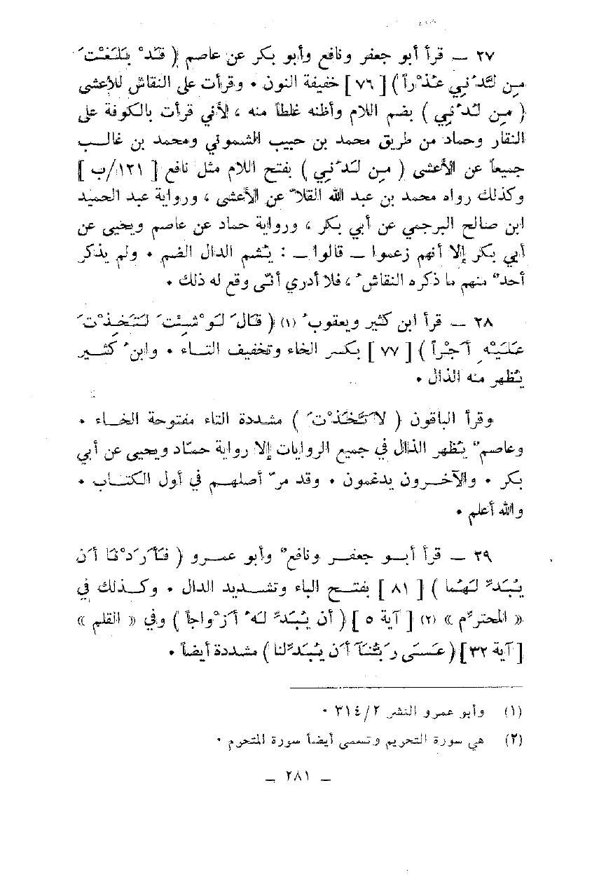 29 - قرأ أبو جعفر ونافع وأبو عمرو {فَأَرَدْنَا أَنْ يُبْدِلَهُمَا} [81] بفتح الباء وتشديد الدال. وكذلك في "المحترم" [آية 5] {أَنْ يُبْدِلَهُ أَزْوَاجًا} وفي "القلم" [آية 32] {عَسَى رَبُّنَا أَنْ يُبْدِلَنَا} مشددة أيضا.