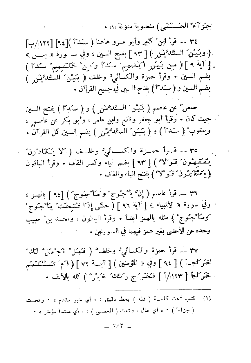 34 - قرأ ابن كثير وأبو عمرو هاهنا {سَدًّا} [94] {بَيْنَ السَّدَّيْنِ} [93] بفتح السين، وفي سورة "يس" [آية 9] {مِنْ بَيْنِ أَيْدِيهِمْ سَدًّا وَمِنْ خَلْفِهِمْ سَدًّا} بضم السين. وقرأ حمزة والكسائي وخلف {بَيْنَ السَّدَّيْنِ} بضم السين و {سَدًّا} بفتح السين في جميع القرآن.