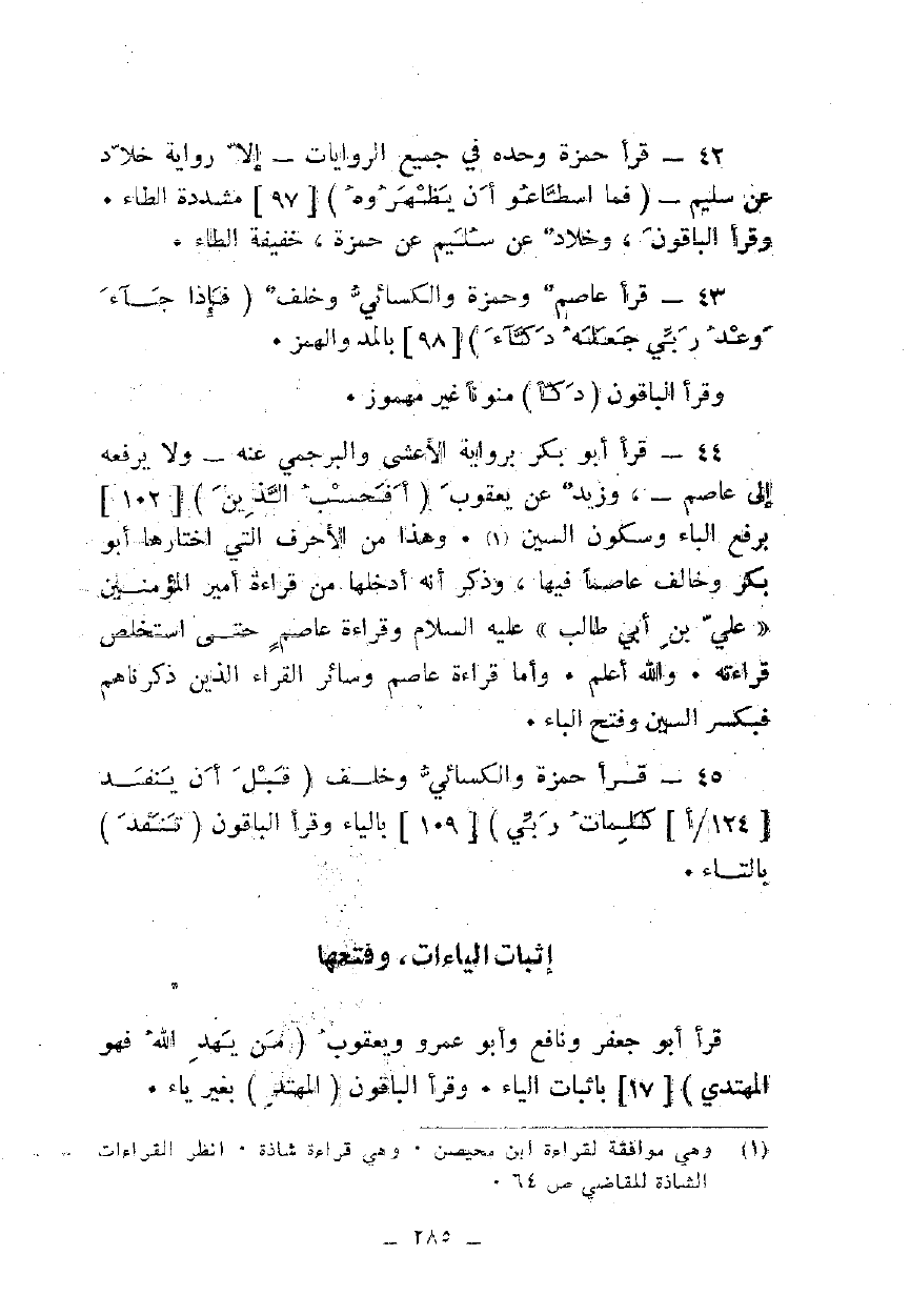 42 - قرأ حمزة وحده في جميع الروايات - إلا رواية خلاد عن سليم - {فَمَا اسْطَاعُوا أَنْ يَظْهَرُوهُ} [97] مشددة الطاء. وقرأ الباقون، وخلاد عن سليم عن حمزة، خفيفة الطاء.