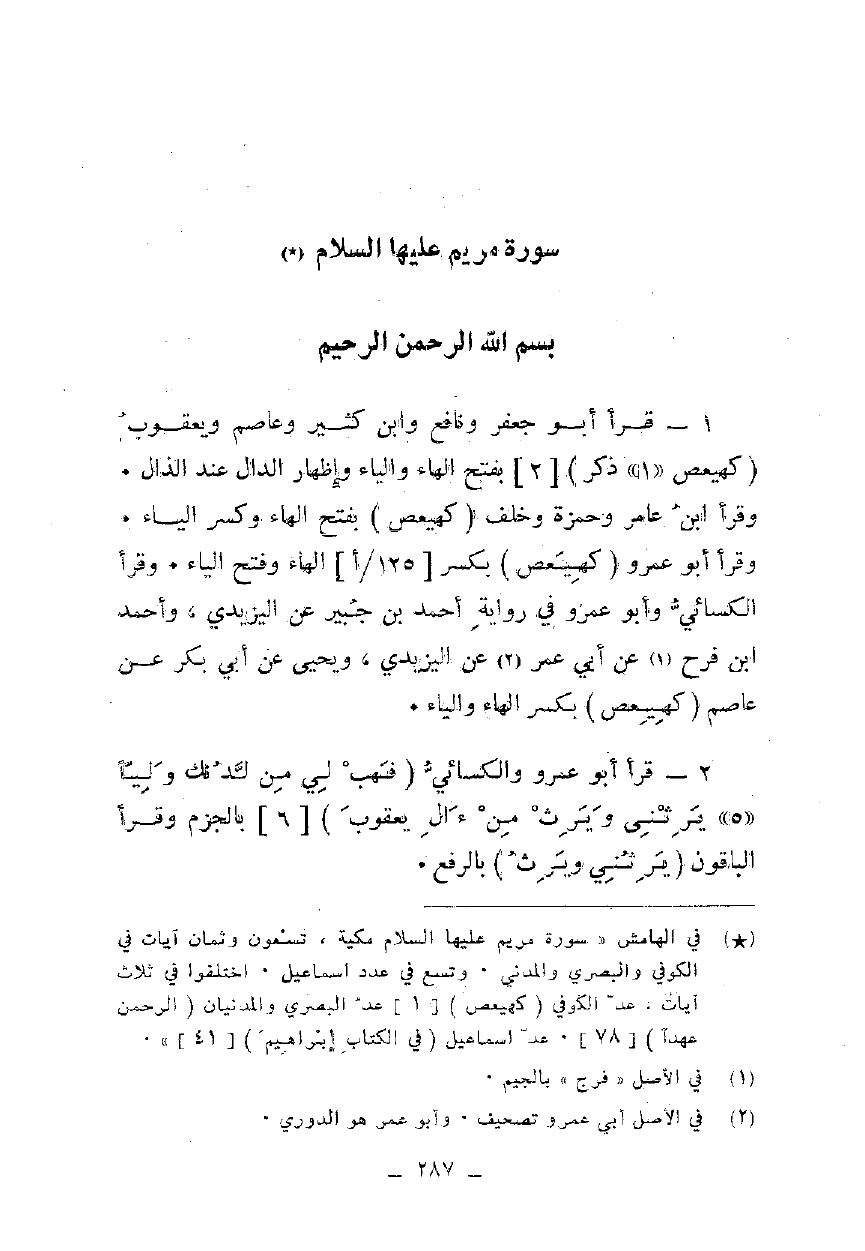 1 - قرأ أبو جعفر ونافع وابن كثير وعاصم ويعقوب {كهيعص (1) ذِكْرُ} [2] بفتح الهاء والياء وإظهار الدال عند الذال. وقرأ ابن عامر وحمزة وخلف {كهيعص} بفتح الهاء وكسر الياء. وقرأ أبو عمرو {كهيعص} بكسر الهاء وفتح الياء. وقرأ الكسائي وأبو عمرو في رواية أحمد بن جبير عن اليزيدي، وأحمد ابن فرح عن أبي عمر عن اليزيدي، ويحيى عن أبي بكر عن عاصم {كهيعص} بكسر الهاء والياء.