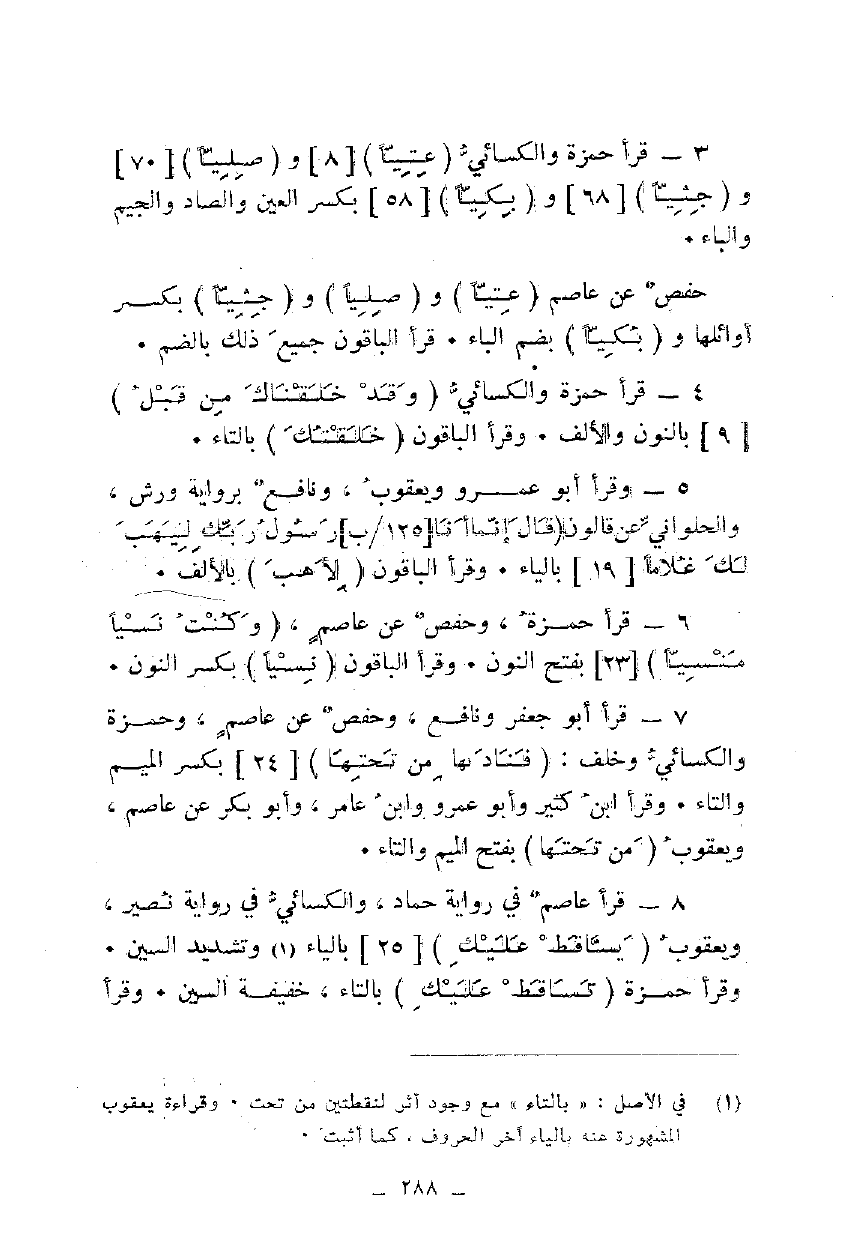 8 - قرأ عاصم في رواية حماد، والكسائي في رواية نصير، ويعقوب {تُسَاقِطْ عَلَيْكِ} [25] بالياء وتشديد السين. وقرأ حمزة {تُسَاقِطْ عَلَيْكِ} بالتاء، خفيفة السين. وقرأ