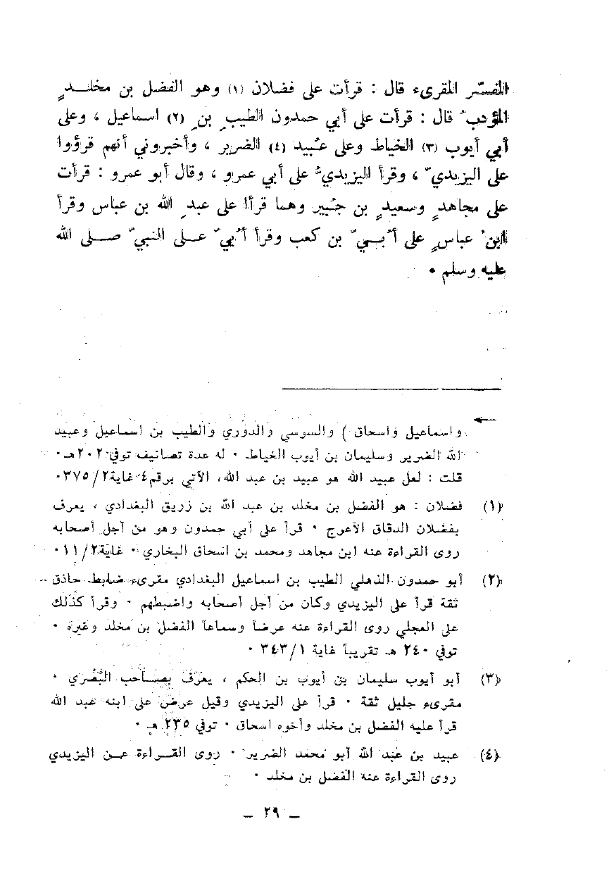 المفسر المقرئ قال: قرأت على فضلان وهو الفضل بن مخلد المؤدب قال: قرأت على أبي حمدون الطيب بن إسماعيل، وعلى أبي أيوب الخياط وعلى عبيد الضرير، وأخبروني أنهم قرؤوا على اليزيدي، وقرأ اليزيدي على أبي عمرو، وقال أبو عمرو: قرأت على مجاهد وسعيد بن جبير وهما قرأا على عبد الله بن عباس وقرأ ابن عباس على أبي بن كعب وقرأ أبي على النبي صلى الله عليه وسلم.