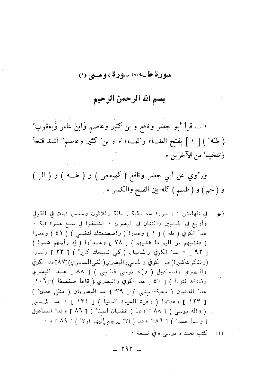 1 - قرأ أبو جعفر ونافع وابن كثير وعاصم وابن عامر ويعقوب {طه} [1] بفتح الطاء والهاء. وابن كثير وعاصم أشد فتحا وتفخيما من الآخرين.