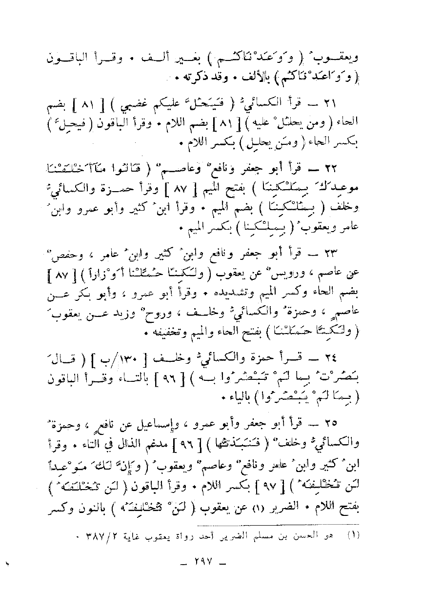 23 - قرأ أبو جعفر ونافع وابن كثير وابن عامر، وحفص عن عاصم، ورويس عن يعقوب {وَلَكِنَّا حُمِّلْنَا أَوْزَارًا} [87] بضم الحاء وكسر الميم وتشديده. وقرأ أبو عمرو، وأبو بكر عن عاصم، وحمزة والكسائي وخلف، وروح وزيد عن يعقوب {وَلَكِنَّا حُمِّلْنَا} بفتح الحاء والميم وتخفيفه.