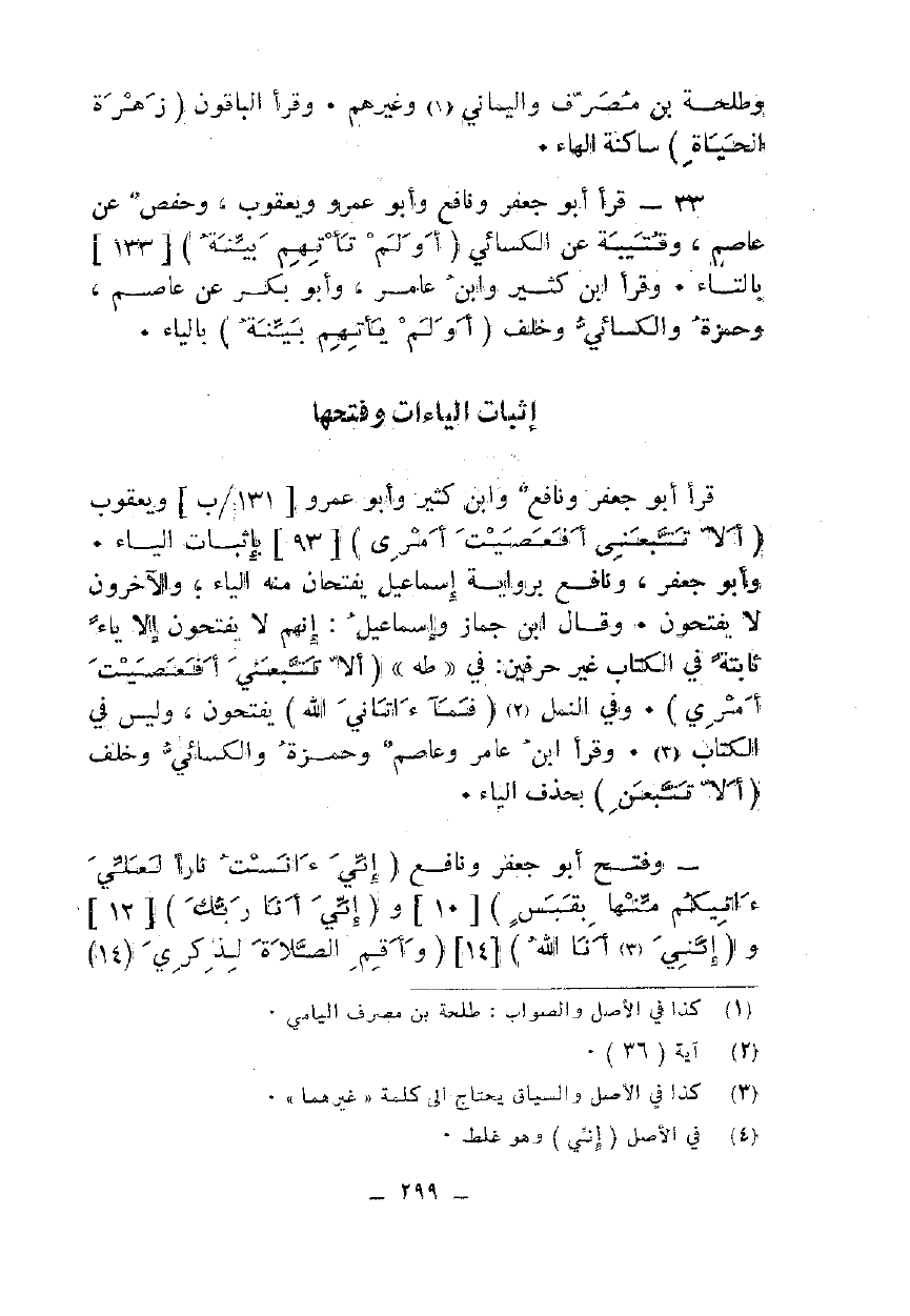 قرأ أبو جعفر ونافع وابن كثير وأبو عمرو ويعقوب {أَلَّا تَتَّبِعَنِ أَفَعَصَيْتَ أَمْرِي} [93] بإثبات الياء. وأبو جعفر، ونافع برواية إسماعيل يفتحان منه الياء؛ والآخرون لا يفتحون. وقال ابن جماز وإسماعيل: إنهم لا يفتحون إلا ياء ثابتة في الكتاب غير حرفين: في"طه" {أَلَّا تَتَّبِعَنِ أَفَعَصَيْتَ أَمْرِي}. وفي النمل {فَمَا آتَانِيَ اللَّهُ} يفتحون، وليس في الكتاب. وقرأ ابن عامر وعاصم وحمزة والكسائي وخلف {أَلَّا تَتَّبِعَنِ} بحذف الياء.