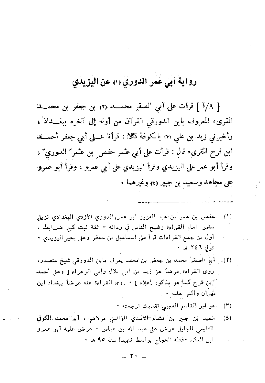 قرأت على أبي الصقر محمد بن جعفر بن محمد المقرئ المعروف بابن الدورقي القرآن من أوله إلى آخره ببغداد، وأخبرني زيد بن علي بالكوفة قالا: قرأنا على أبي جعفر أحمد ابن فرح المقرئ قال: قرأت على أبي عمر حفص بن عمر الدوري، وقرأ أبو عمر على اليزيدي وقرأ اليزيدي على أبي عمرو، وقرأ أبو عمرو على مجاهد وسعيد بن جبير وغيرهما.