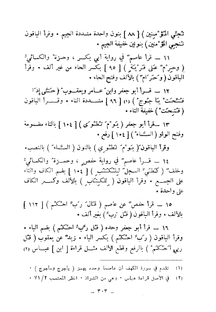 14 - قرأ عاصم في رواية حفص، وحمزة والكسائي وخلف {كَطَيِّ السِّجِلِّ لِلْكُتُبِ} [104] بضم الكاف والتاء على الجمع. وقرأ الباقون {لِلْكُتُبِ} بالألف وكسر الكاف على واحدة.