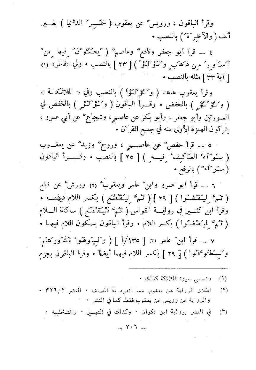 4 - قرأ أبو جعفر ونافع وعاصم {يُحَلَّوْنَ فِيهَا مِنْ أَسَاوِرَ مِنْ ذَهَبٍ وَلُؤْلُؤًا} [23] بالنصب. وفي "فاطر" [آية 33] مثله بالنصب.