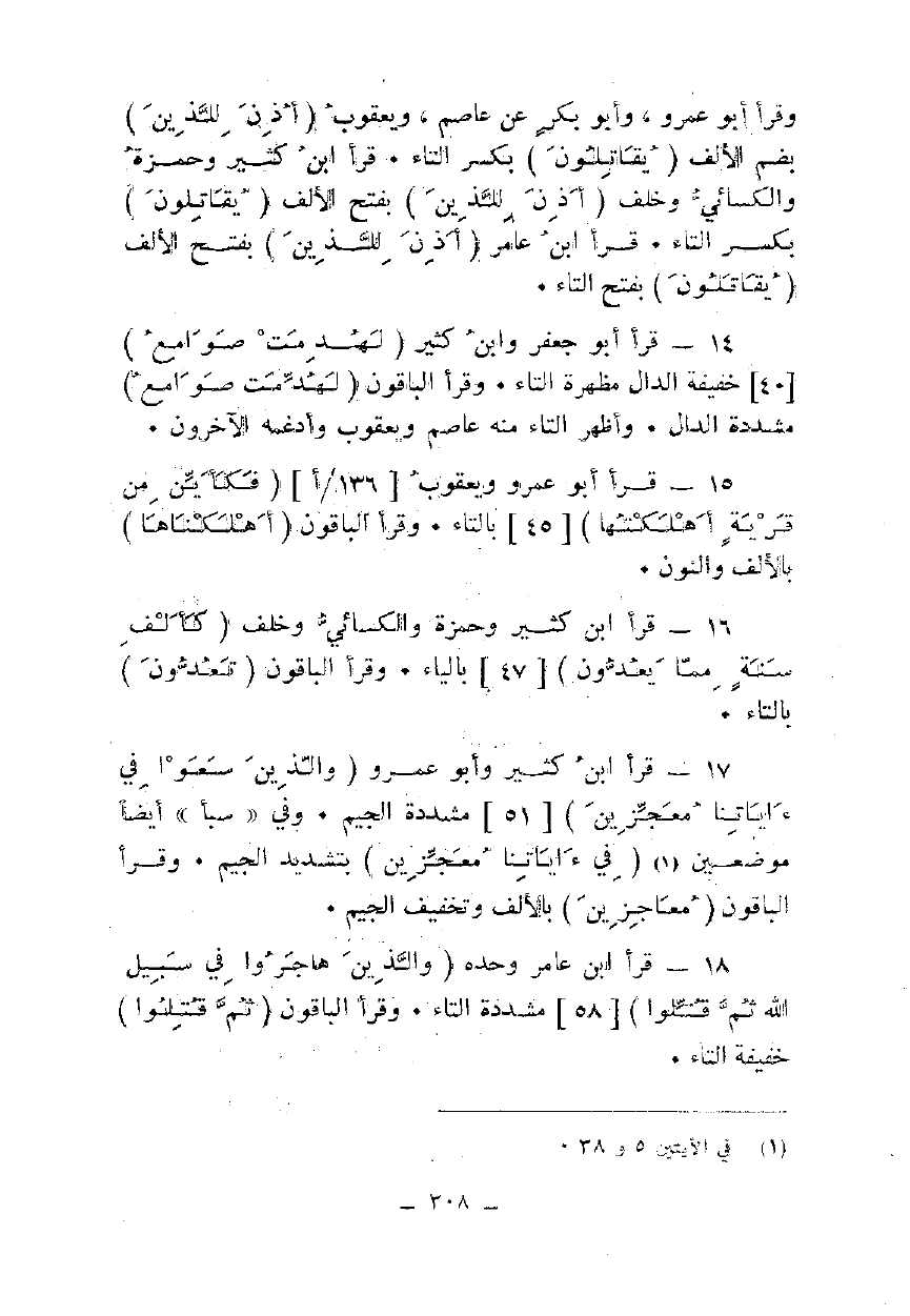 18 - قرأ ابن عامر وحده {وَالَّذِينَ هَاجَرُوا فِي سَبِيلِ اللَّهِ ثُمَّ قُتِلُوا} [58] مشددة التاء. وقرأ الباقون {ثُمَّ قُتِلُوا} خفيفة التاء.