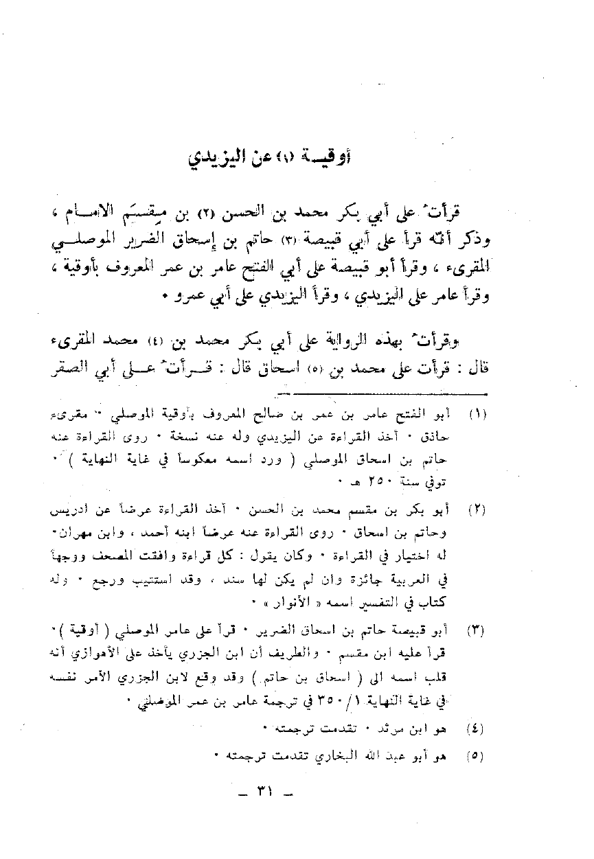 قرأت على أبي بكر محمد بن الحسن بن مقسم الإمام وذكر أنه قرأ على أبي قبيصة حاتم بن إسحاق الضرير الموصلي المقرئ، وقرأ أبو قبيصة على أبي الفتح عامر بن عمر المعروف بأوقية، وقرأ عامر على اليزيدي، وقرأ اليزيدي على أبي عمرو.