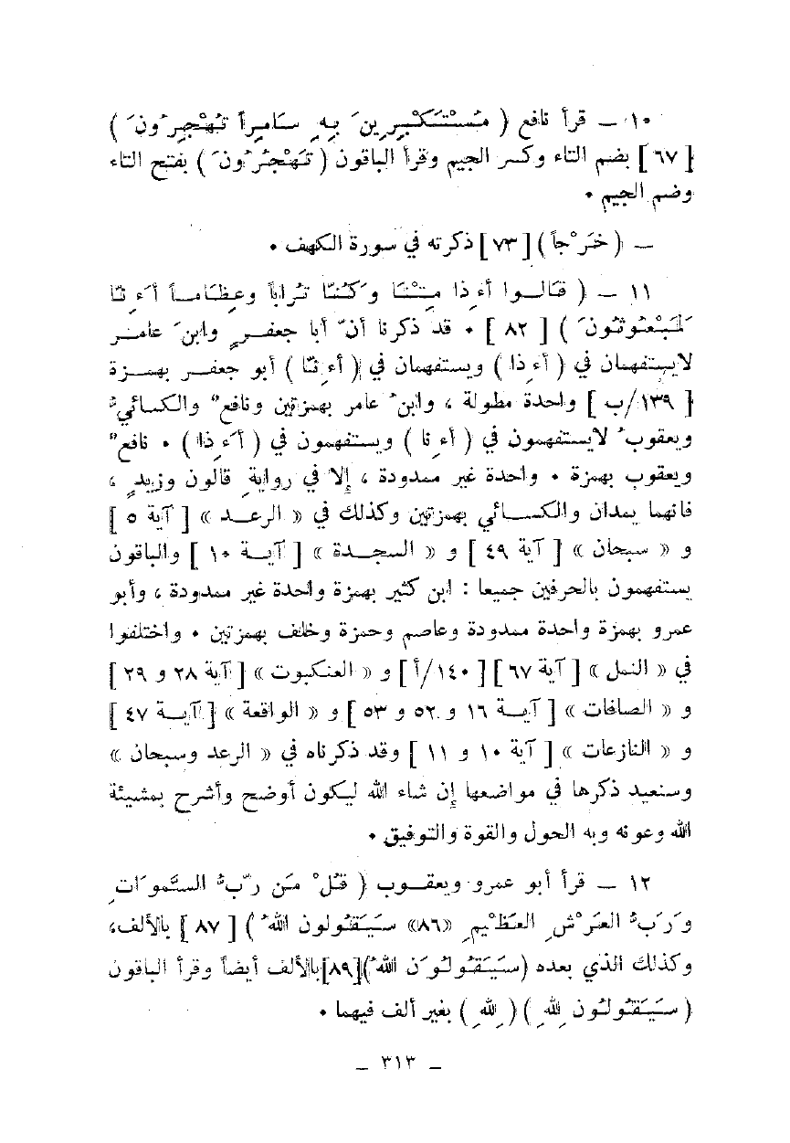 12 - قرأ أبو عمرو ويعقوب {قُلْ مَنْ رَبُّ السَّمَاوَاتِ السَّبْعِ وَرَبُّ الْعَرْشِ الْعَظِيمِ (86) سَيَقُولُونَ لِلَّهِ} [87] بالألف، وكذلك الذي بعده {فَسَيَقُولُونَ اللَّهُ} [89] بالألف أيضا وقرأ الباقون {سَيَقُولُونَ لِلَّهِ} {لِلَّهِ} بغير ألف فيهما.