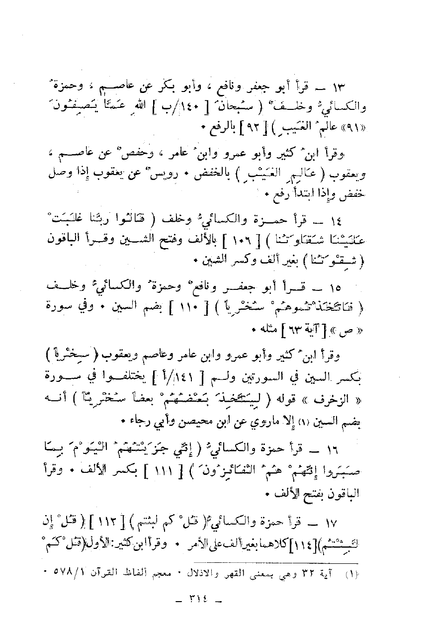 15 - قرأ أبو جعفر ونافع وحمزة والكسائي وخلف {فَاتَّخَذْتُمُوهُمْ سِخْرِيًّا} [110] بضم السين. وفي سورة "ص" [آية 63] مثله.