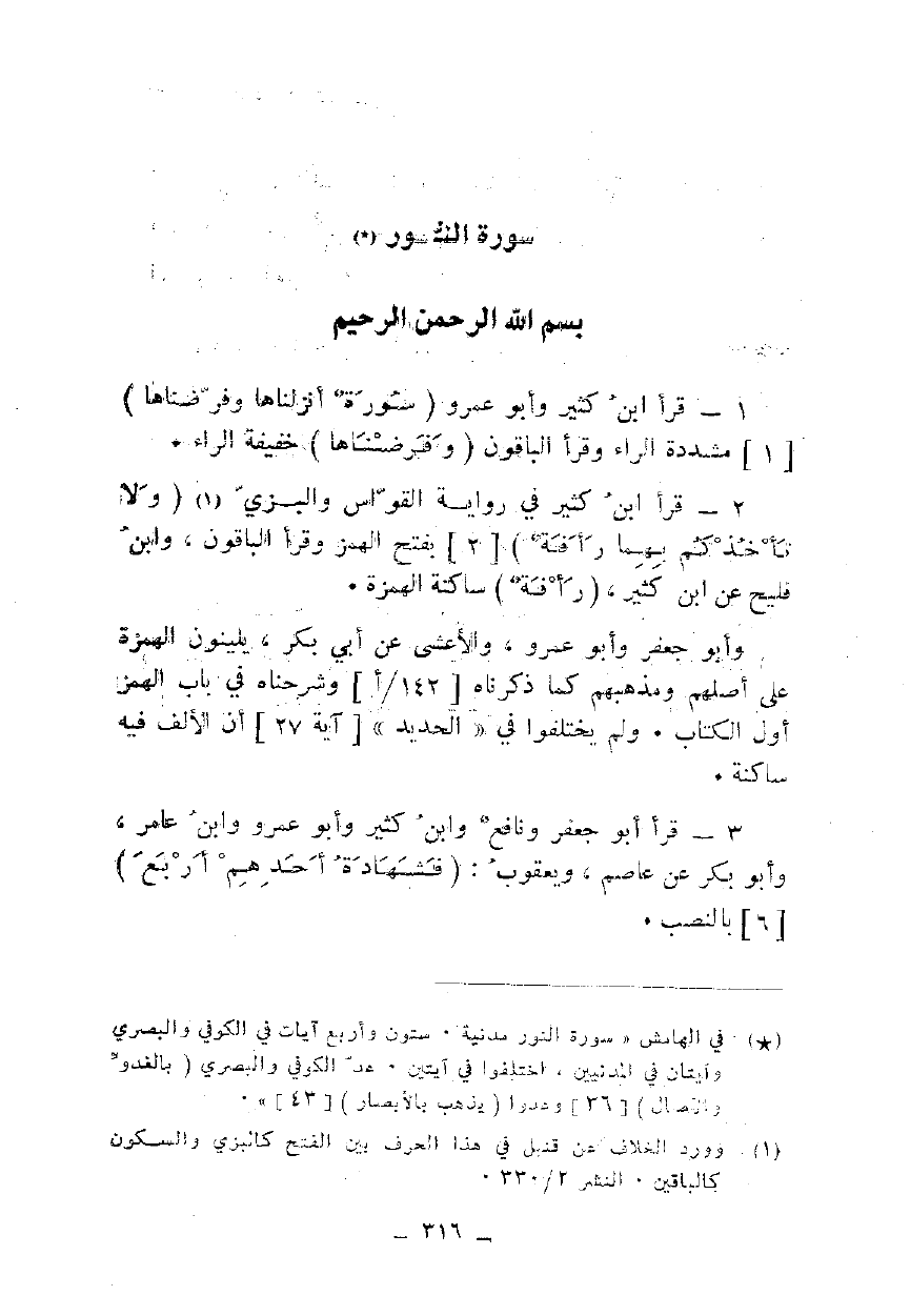 1 - قرأ ابن كثير وأبو عمرو {سُورَةٌ أَنْزَلْنَاهَا وَفَرَضْنَاهَا} [1] مشددة الراء وقرأ الباقون {وَفَرَضْنَاهَا} خفيفة الراء.