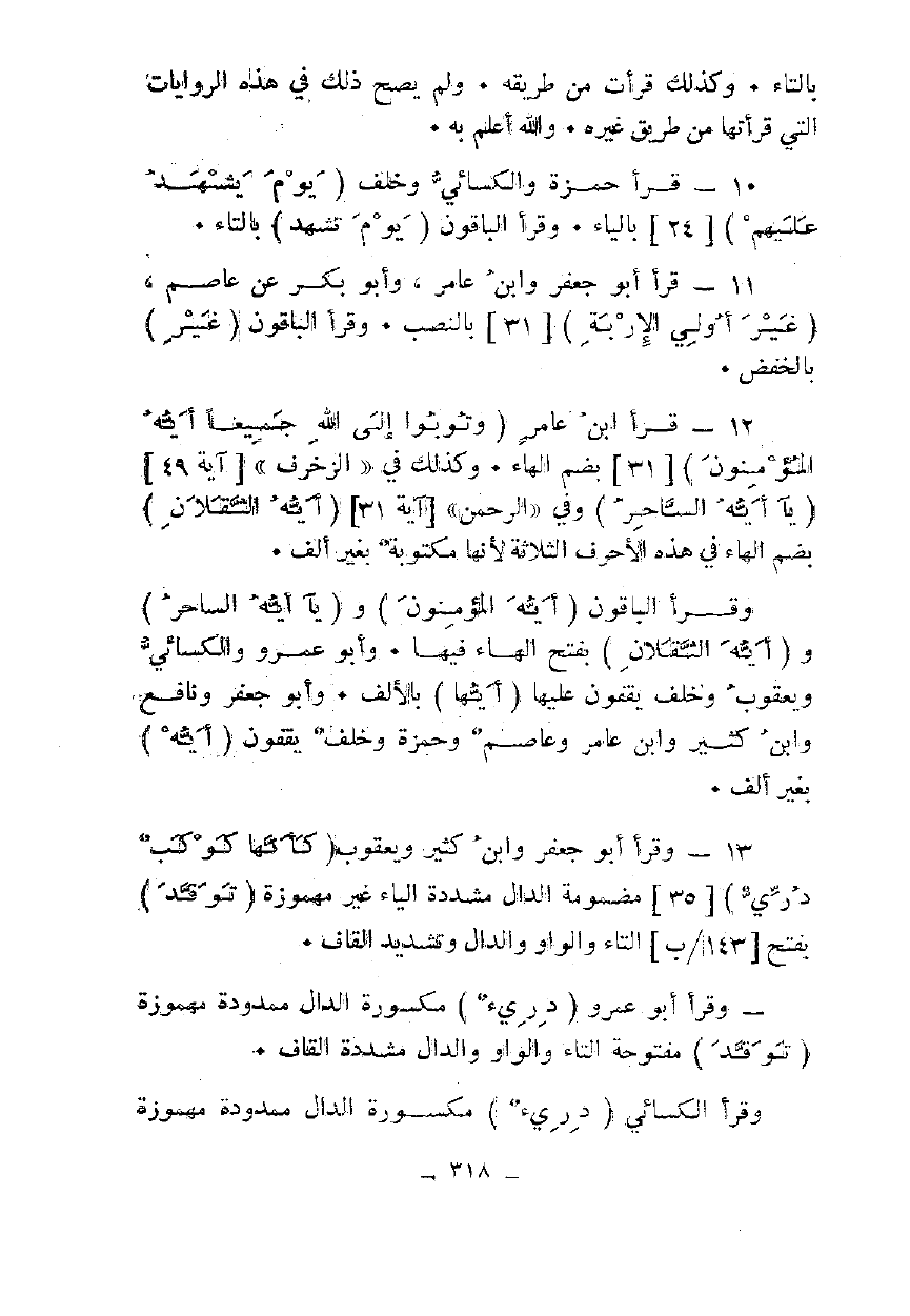 12 - قرأ ابن عامر {وَتُوبُوا إِلَى اللَّهِ جَمِيعًا أَيُّهَ الْمُؤْمِنُونَ} [31] بضم الهاء. وكذلك في "الزخرف" [آية 49] {يَا أَيُّهَ السَّاحِرُ} وفي "الرحمن" [آية 31] {أَيُّهَ الثَّقَلَانِ} بضم الهاء في هذه الأحرف الثلاثة لأنها مكتوبة بغير ألف.