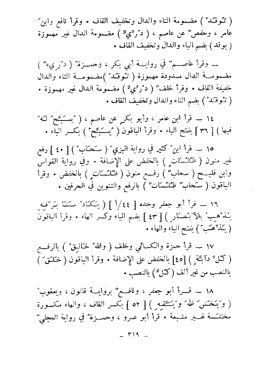 15 - قرأ ابن كثير في رواية البزي {سَحَابٌ} [40] رفع غير منون {ظُلُمَاتٍ} بالخفض على الإضافة. وفي رواية القواس وابن فليح {سَحَابٌ} رفع منون {ظُلُمَاتٍ} بالخفض. وقرأ الباقون {سَحَابٌ ظُلُمَاتٌ} بالرفع والتنوين في الحرفين.