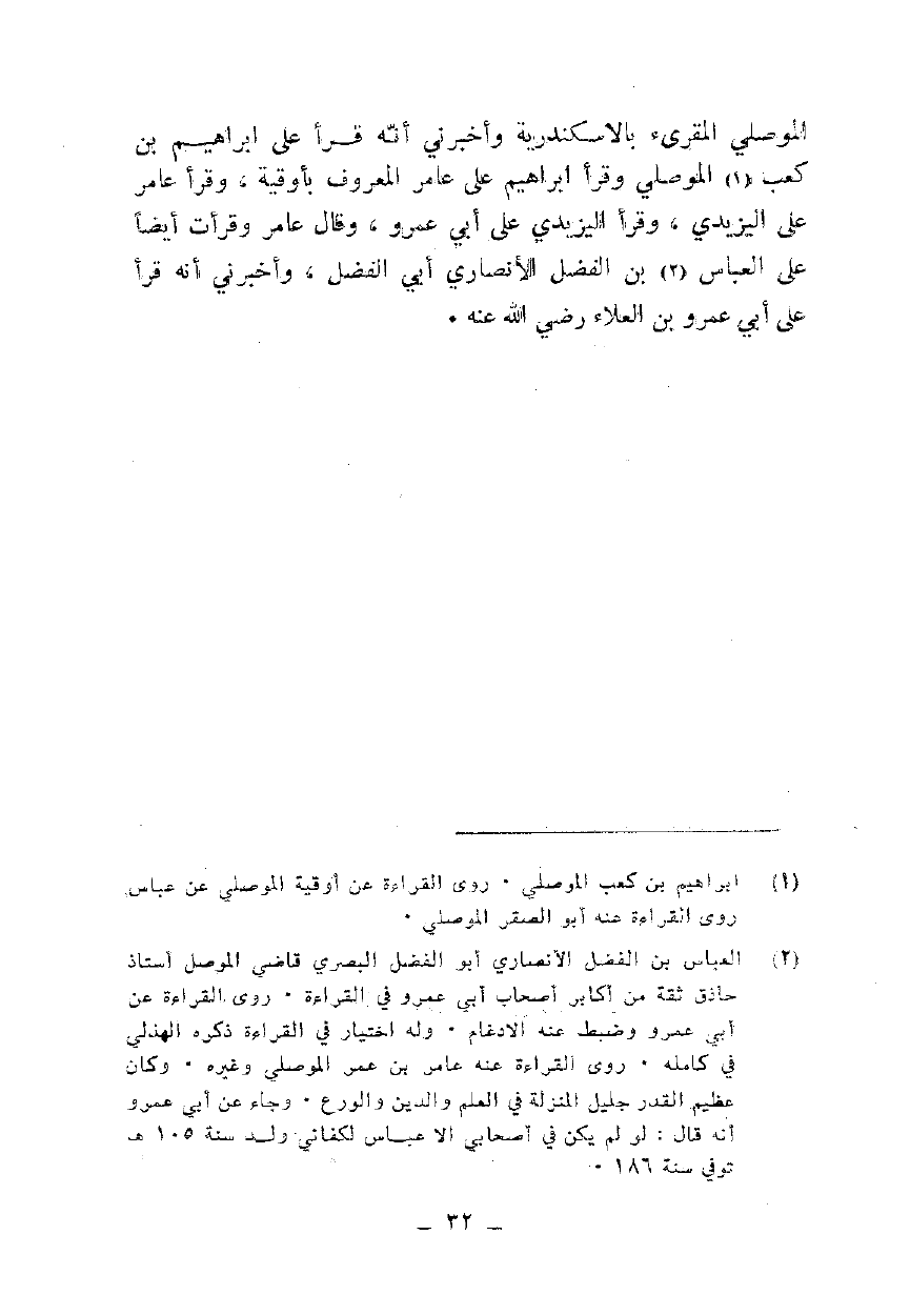الموصلي المقرئ بالإسكندرية وأخبرني أنه قرأ على إبراهيم بن كعب الموصلي وقرأ إبراهيم على عامر المعروف بأوقية، وقرأ عامر على اليزيدي، وقرأ اليزيدي على أبي عمرو، وقال عامر وقرأت أيضا على العباس بن الفضل الأنصاري أبي الفضل، وأخبرني أنه قرأ على أبي عمرو بن العلاء رضي الله عنه.