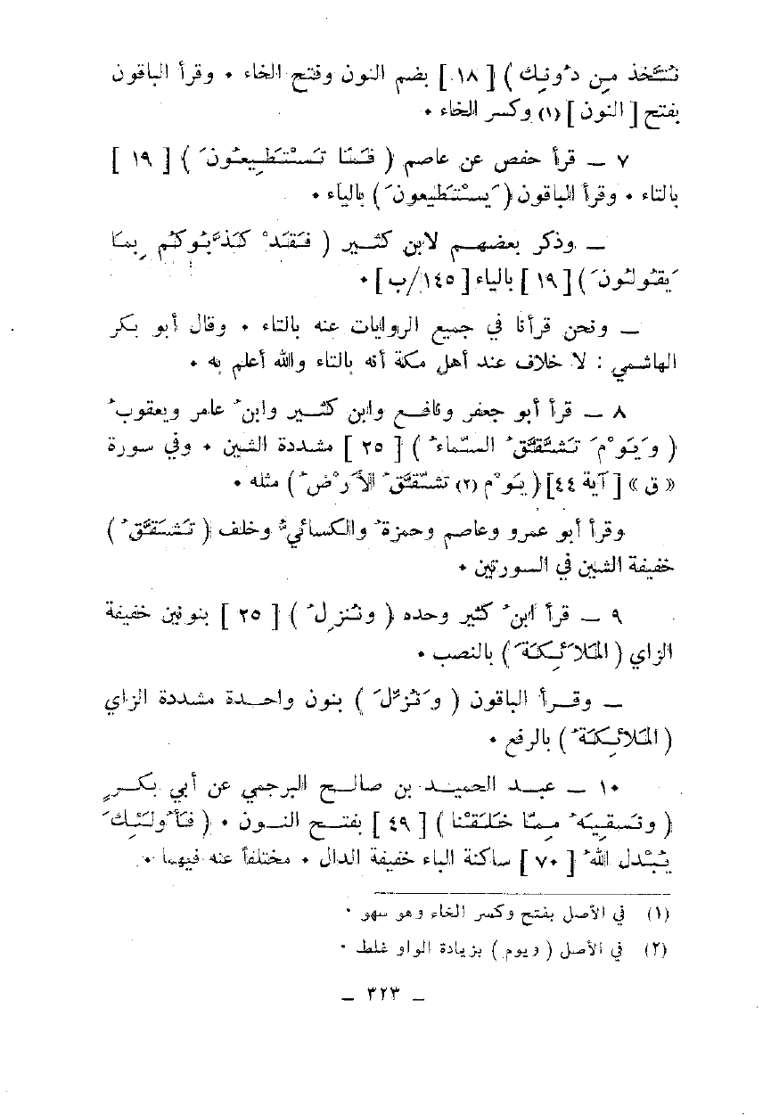 10 - عبد الحميد بن صالح البرجمي عن أبي بكر {وَنُسْقِيَهُ مِمَّا خَلَقْنَا} [49] بفتح النون. {ففَأُولَئِكَ يُبَدِّلُ اللَّهُ} [70] ساكنة الباء خفيفة الدال. مختلفا عنه فيهما.