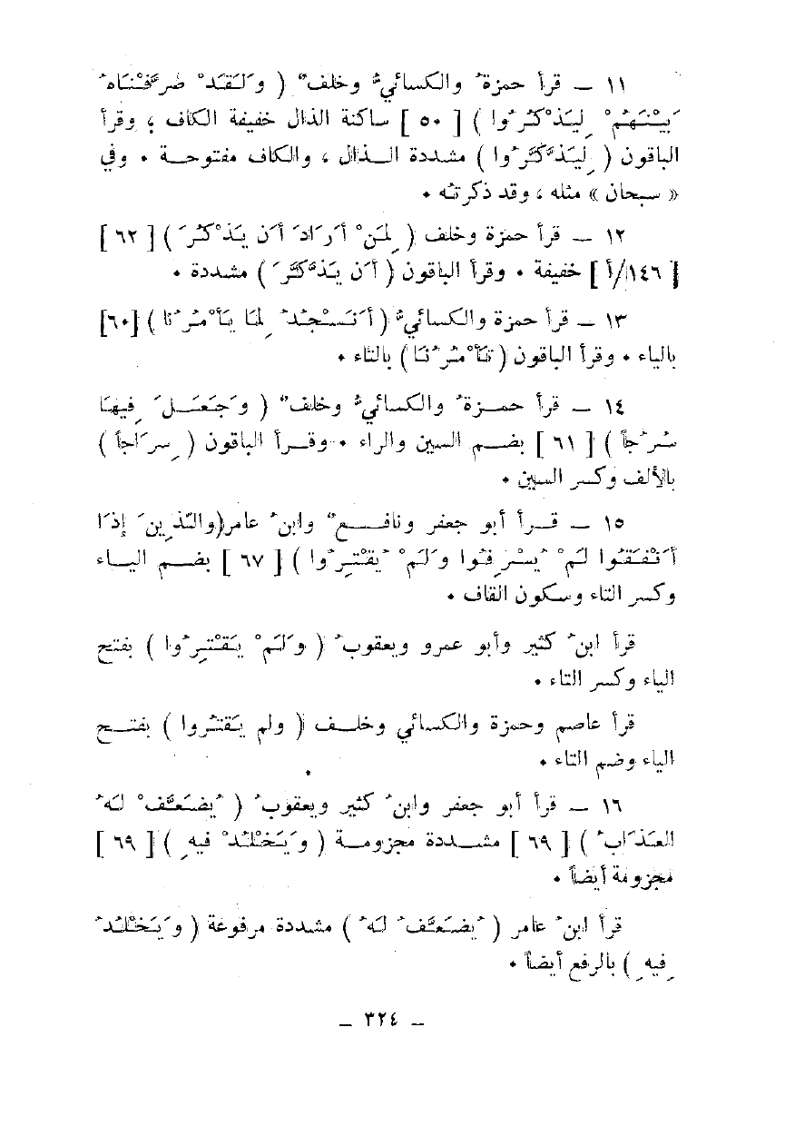 11 - قرأ حمزة والكسائي وخلف {وَلَقَدْ صَرَّفْنَاهُ بَيْنَهُمْ لِيَذَّكَّرُوا} [50] ساكنة الذال خفيفة الكاف؛ وقرأ الباقون {لِيَذَّكَّرُوا} مشددة الذال، والكاف مفتوحة. وفي "سبحان" مثله، وقد ذكرته.