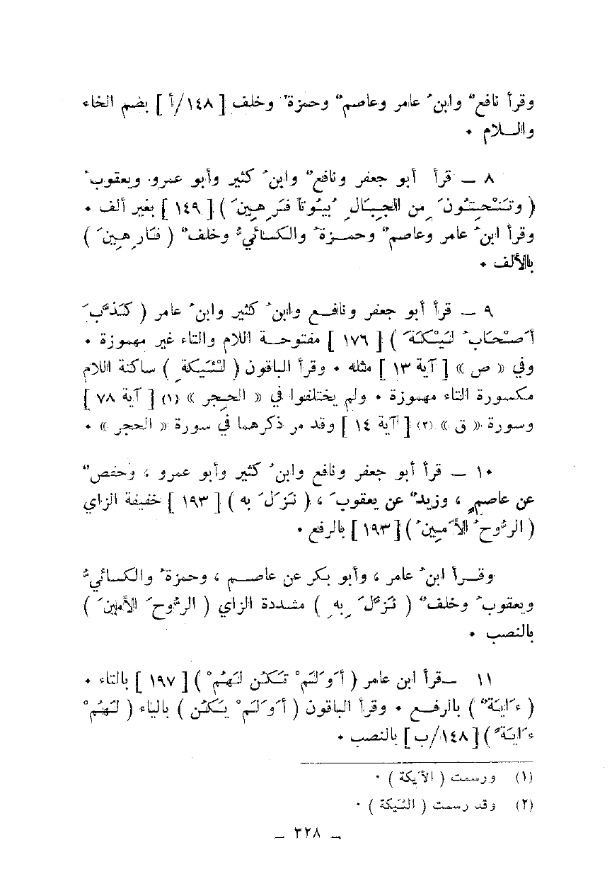 9 - قرأ أبو جعفر ونافع وابن كثير وان عامر {كَذَّبَ أَصْحَابُ الْأَيْكَةِ} [176] مفتوحة اللام والتاء غير مهموزة. وفي "ص" [آية 13] مثله. وقرأ الباقون {لئيكة} ساكنة اللام مكسورة التاء مهموزة. ولم يختلفوا في "الحجر" [آية 78] وسورة "ق" [آية 14] وقد مر ذكرهما في سورة "الحجر".
