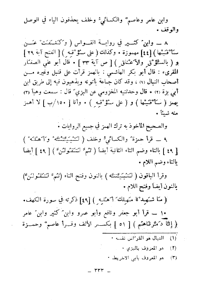 8 - وابن كثير في رواية القواس {وَكَشَفَتْ عَنْ سَاقَيْهَا} [44] مهموزة. وكذلك {عَلَى سُوقِهِ} [الفتح آية 29] و {بِالسُّوقِ وَالْأَعْنَاقِ} [ص آية 33]. قال أبو علي الصفار المقرئ: قال أبو بكر الهاشمي: بالهمز قرأت على قنبل وغيره من أصحاب النبال، وقد كان جماعة يأتونه ويذهبون فيه إلى طريق ابن أبي بزة. قال وحدثنيه المخزومي عن البزي قال: سمعت وهبا يهمز {سَاقَيْهَا} و {عَلَى سُوقِهِ}. وأنا لا أهمز منه شيئا.