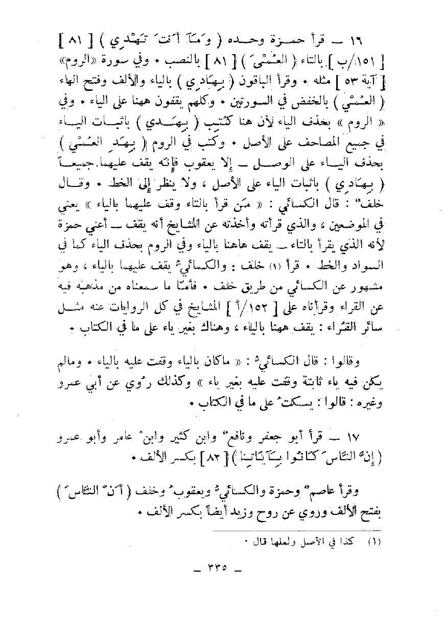 16 - قرأ حمزة وحده {وَمَا أَنْتَ بِهَادِي} [81] بالتاء {الْعُمْيِ} [81] بالنصب. وفي سورة "الروم" [آية 53] مثله. وقرأ الباقون {بِهَادِي} بالياء والألف وفتح الهاء {الْعُمْيِ} بالخفض في السورتين. وكلهم يقفون ههنا على الياء. وفي "الروم" بحذف الياء لأن هنا كتب {بِهَادِي} باثبات الياء في جميع المصاحف على الأصل. وكتب في الروم {بِهَادِي الْعُمْيِ} بحذف الياء على الوصل - إلا يعقوب فإنه يقف عليهما جميعا {بِهَادِي} بإثبات الياء على الأصل، ولا ينظر إلى الخط. وقال خلف: قال الكسائي: "من قرأ بالتاء وقف عليهما بالياء" يعني في الموضعين، والذي قرأته وأخذته عن المشايخ أنه يقف - أعني حمزة لأنه الذي يقرأ بالتاء - يقف هاهنا بالياء وفي الروم بحذف الياء كما في السواد والخط. قرأ خلف: والكسائي يقف عليهما بالياء، وهو مشهور عن الكسائي من طريق خلف. فأما ما سمعناه من مذهبه فيه عن القراء وقرأناه على المشايخ في كل الروايات عنه مثل سائر القراء: يقف ههنا بالياء، وهناك بغير ياء على ما في الكتاب.