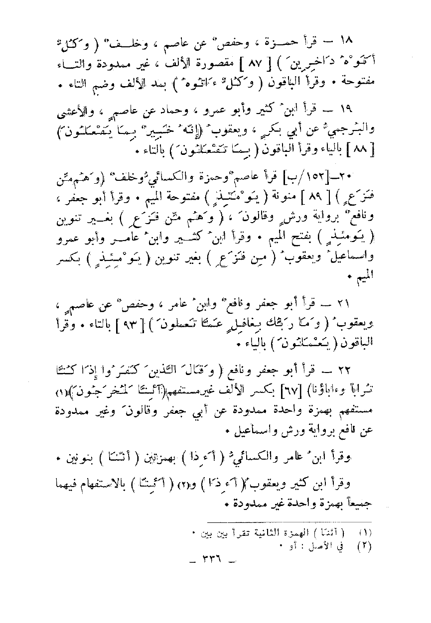 18 - قرأ حمزة، وحفص عن عاصم، وخلف {وَكُلٌّ أَتَوْهُ دَاخِرِينَ} [87] مقصورة الألف، غير ممدودة والتاء مفتوحة. وقرأ الباقون {وَكُلٌّ أَتَوْهُ} بمد الألف وضم التاء.
