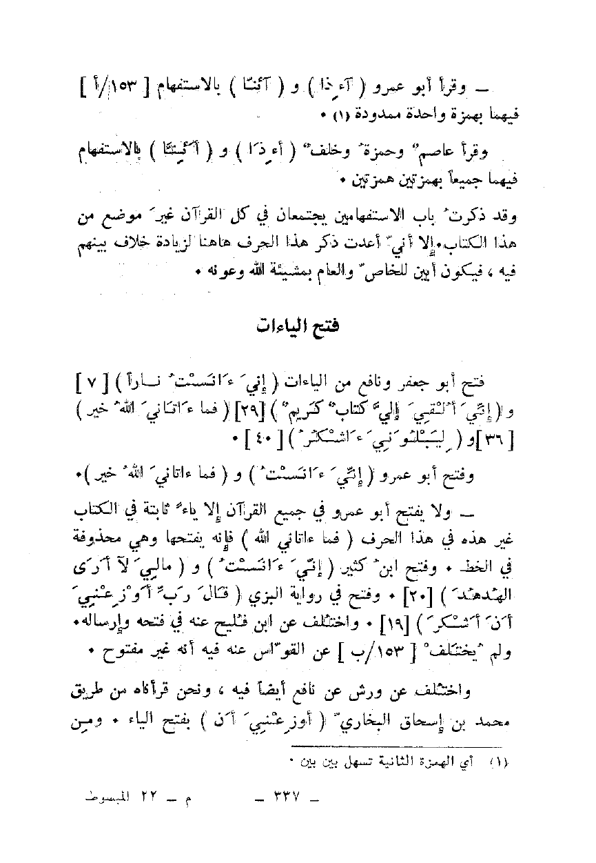 - ولا يفتح أبو عمرو في جميع القرآن إلا ياء ثابتة في الكتاب غير هذه في هذا الحرف {فَمَا آتَانِيَ اللَّهُ} فإنه يفتحها وهي محذوفة في الخط. وفتح ابن كثير {إِنِّي آنَسْتُ} و {مَا لِيَ لَا أَرَى الْهُدْهُدَ} [20]. وفتح في رواية البزي {قَالَ رَبِّ أَوْزِعْنِي أَنْ أَشْكُرَ} [19]. واختلف عن ابن فليح عنه في فتحه وإرساله. ولم يختلف عن القواس عنه فيه أنه غير مفتوح.