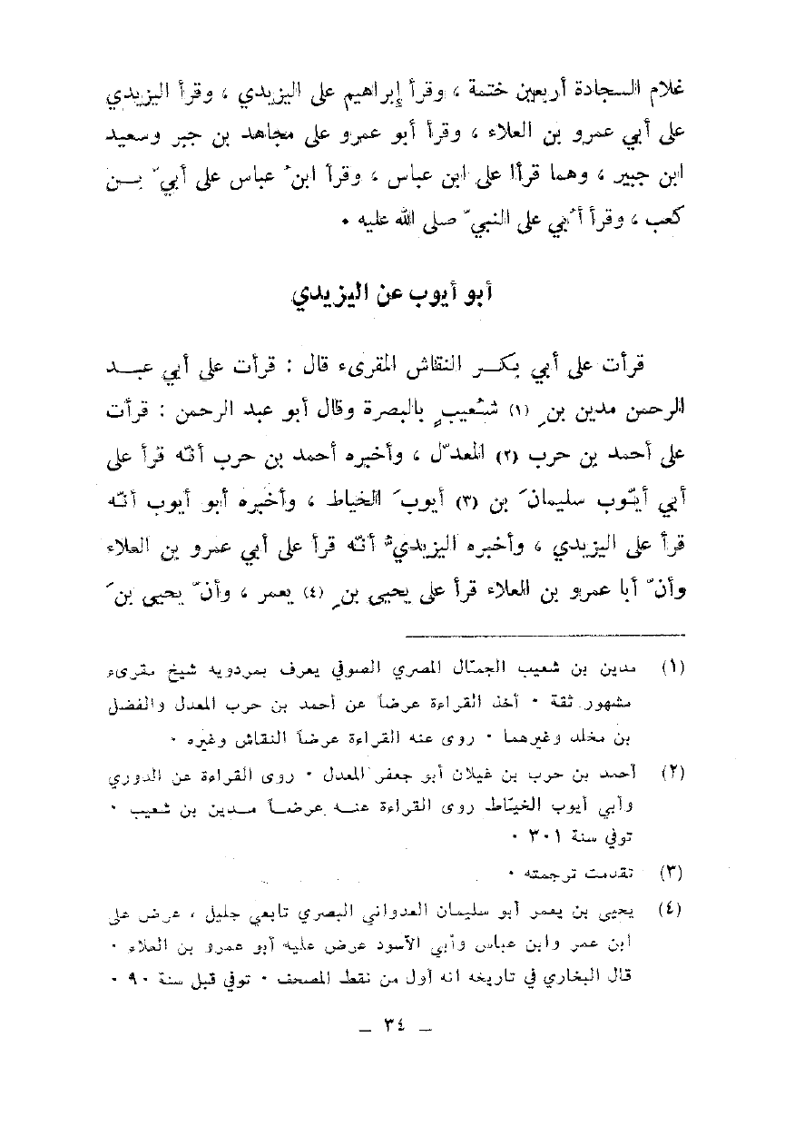 قرأت على أبي بكر النقاش المقرئ قال: قرأت على أبي عبد الرحمن مدين بن شعيب بالبصرة وقال أبو عبد الرحمن: قرأت على أحمد بن حرب المعدل، وأخبره أحمد بن حرب أنه قرأ على أبي أيوب سليمان بن أيوب الخياط، وأخبره أبو أيوب أنه قرأ على اليزيدي، وأخبره اليزيدي أنه قرأ على أبي عمرو بن العلاء وأن أبا عمرو بن العلاء قرأ على يحيى بن يعمر، وأن يحيى بن