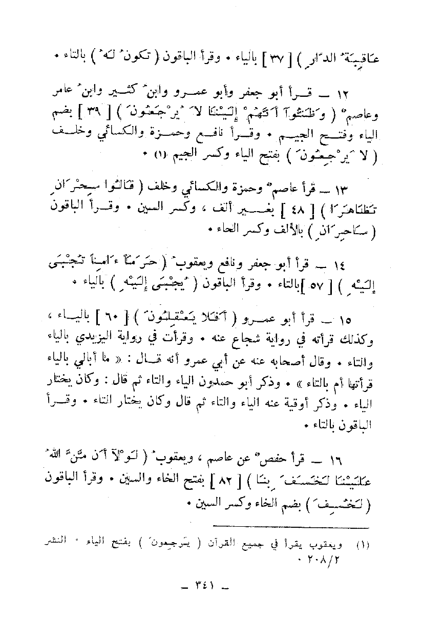 12 - قرأ أبو جعفر وأبو عمرو وابن كثير وابن عامر وعاصم {وَظَنُّوا أَنَّهُمْ إِلَيْنَا لَا يُرْجَعُونَ} [39] بضم الياء وفتح الجيم. وقرأ نافع وحمزة والكسائي وخلف {لَا يُرْجَعُونَ} بفتح الياء وكسر الجيم.