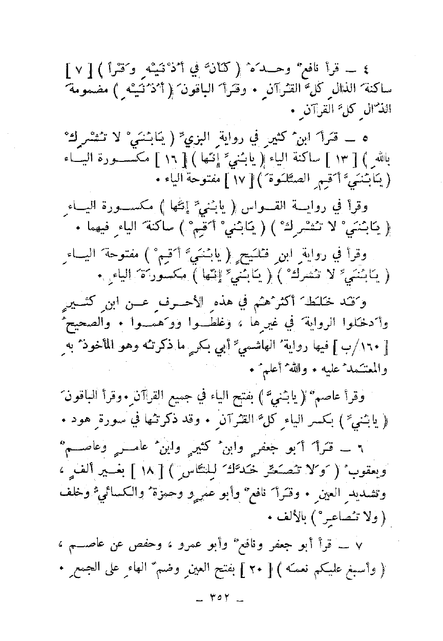 5 - قرأ ابن كثير في رواية البزي {يَا بُنَيَّ لَا تُشْرِكْ بِاللَّهِ} [13] ساكنة الياء {يَا بُنَيَّ إِنَّهَا} [16] مكسورة الياء {يَا بُنَيَّ أَقِمِ الصَّلَاةَ} [17] مفتوحة الياء.