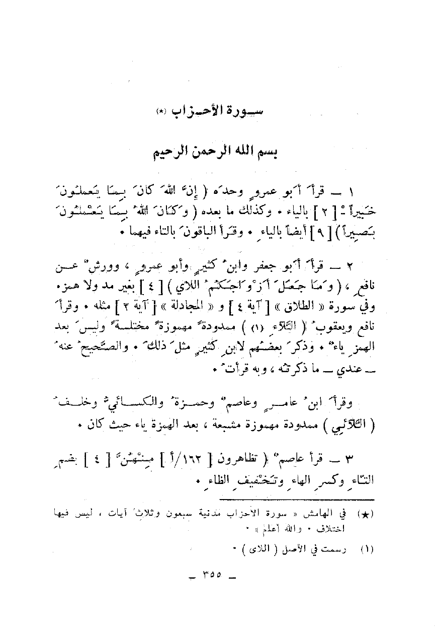 2 - قرأ أبو جعفر وابن كثير وأبو عمرو، وورش عن نافع، {وَمَا جَعَلَ أَزْوَاجَكُمُ اللَّائِي} [4] بغير مد ولا همز. وفي سورة "الطلاق" [آية 4] و"المجادلة" [آية 2] مثله. وقرأ نافع ويعقوب {اللَّائِي} ممدودة مهموزة مختلسة وليس بعد الهمز ياء. وذكر بعضهم لابن كثير مثل ذلك. والصحيح عنه - عندي - ما ذكرته، وبه قرأت.