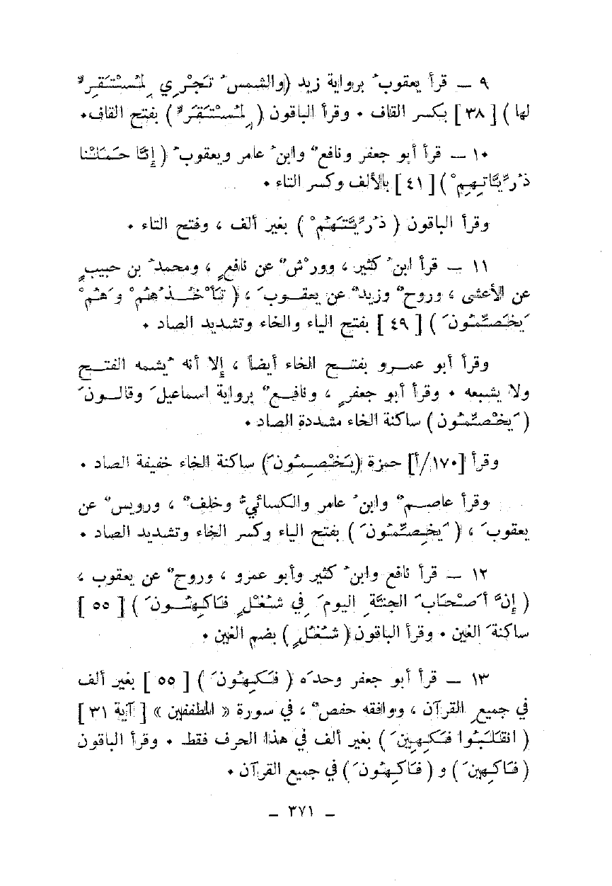 13 - قرأ أبو جعفر وحده {فَاكِهُونَ} [55] بغير ألف في جميع القرآن، ووافقه حفص، في سورة "المطففين" [آية 31] {انْقَلَبُوا فَكِهِينَ} بغير ألف في هذا الحرف فقط. وقرأ الباقون {فَاكِهِينَ} و {فَاكِهُونَ} في جميع القرآن.