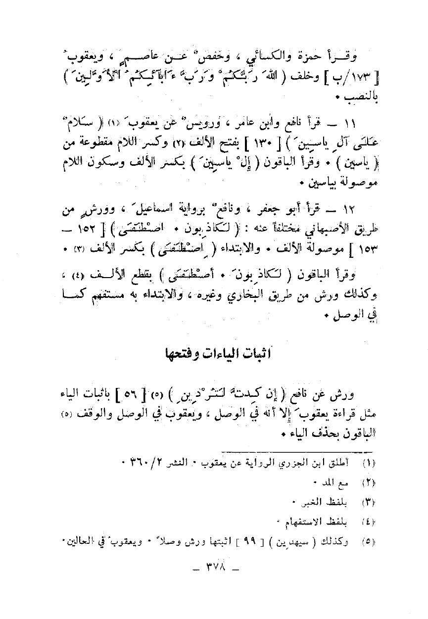 11 - قرأ نافع وابن عامر، ورويس عن يعقوب {سَلَامٌ عَلَى إِلْ يَاسِينَ} [130] بفتح الألف وكسر اللام مقطوعة من {يَاسِينَ}. وقرأ الباقون {إِلْ يَاسِينَ} بكسر الألف وسكون اللام موصولة بياسين.