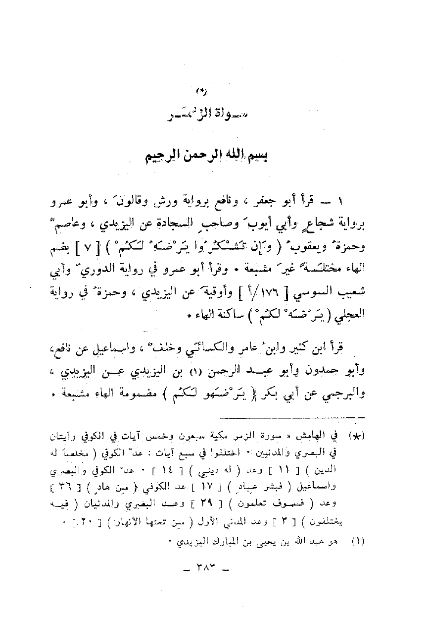 1 - قرأ أبو جعفر، ونافع برواية ورش وقالون، وأبو عمرو برواية شجاع وأبي أيوب وصاحب السجادة عن اليزيدي، وعاصم وحمزة ويعقوب {وَإِنْ تَشْكُرُوا يَرْضَهُ لَكُمْ} [7] بضم الهاء مختلسة غير مشبعة. وقرأ أبو عمرو في رواية الدوري وأبي شعيب السوسي وأوقية عن اليزيدي، وحمزة في رواية العجلي {يَرْضَهُ لَكُمْ} ساكنة الهاء.