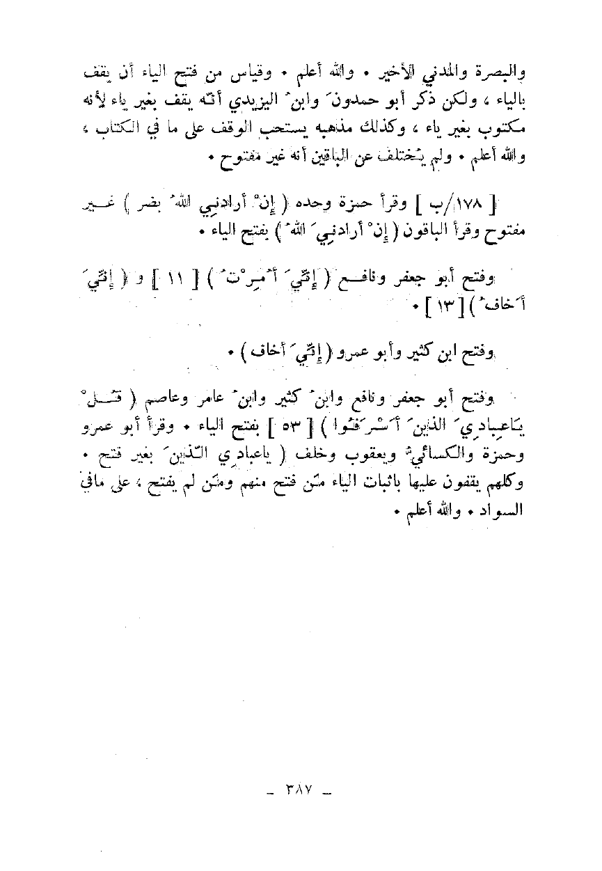 والبصرة والمدني الأخير. والله أعلم. وقياس من فتح الياء أن يقف بالياء، ولكن ذكر أبو حمدون وابن اليزيدي أنه يقف بغير ياء لأنه مكتوب بغير ياء، وكذلك مذهبه يستحب الوقف على ما في الكتاب، والله أعلم. ولم يختلف عن الباقين أنه غير مفتوح.