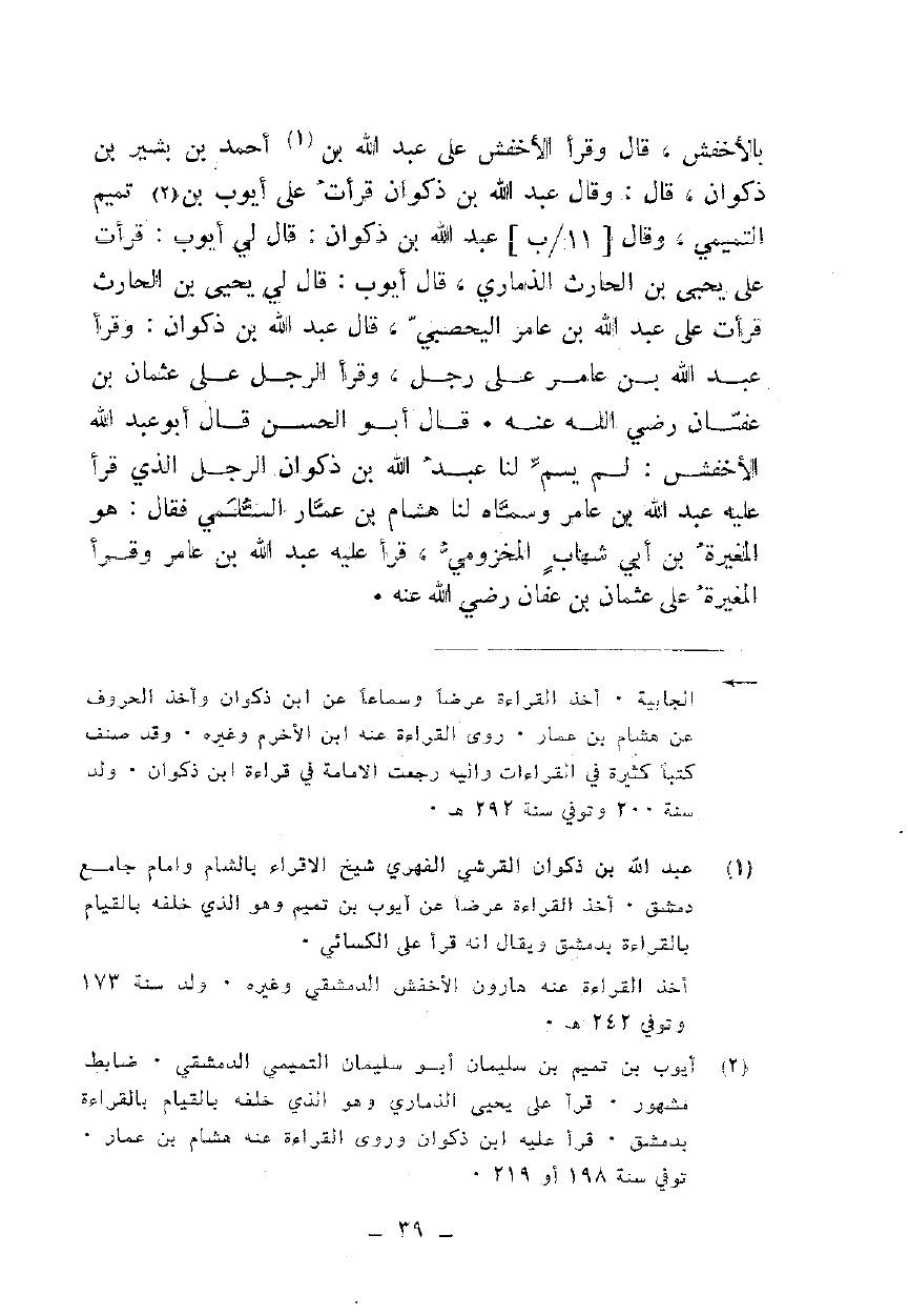 بالأخفش، قال وقرأ الأخفش على عبد الله بن أحمد بن بشير بن ذكوان، قال: وقال عبد الله بن ذكوان قرأت على أيوب بن تميم التميمي، وقال عبد الله بن ذكوان: قال لي أيوب: قرأت على يحيى بن الحارث الذماري، قال أيوب: قال لي يحيى بن الحارث قرأت على عبد الله بن عامر اليحصبي، قال عبد الله بن ذكوان: وقرأ عبد الله بن عامر على رجل، وقرأ الرجل على عثمان بن عفان رضي الله عنه. قال أبو الحسن قال أبو عبد الله الأخفش: لم يسم لنا عبد الله بن ذكوان الرجل الذي قرأ عليه عبد الله بن عامر وسماه لنا هشام بن عمار السلمي فقال: هو المغيرة بن أبي شهاب المخزومي، قرأ عليه عبد الله بن عامر وقرأ المغيرة على عثمان بن عفان رضي الله عنه.