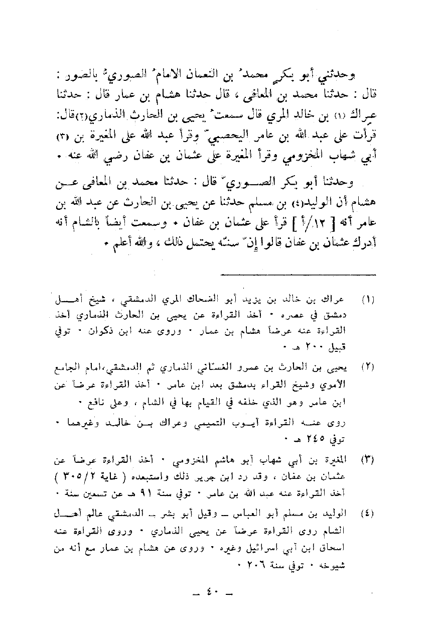 وحدثني أبو بكر محمد بن النعمان الامام الصوري بالصور: قال: حدثنا محمد بن المعافي، قال حدثنا هشام بن عمار قال: حدثنا عراك بن خالد المري قال سمعت يحيى بن الحارث الذماري قال: قرأت على عبد الله بن عامر اليحصبي وقرأ عبد الله على المغيرة بن أبي شهاب المخزومي وقرأ المغيرة على عثمان بن عفان رضي الله عنه.