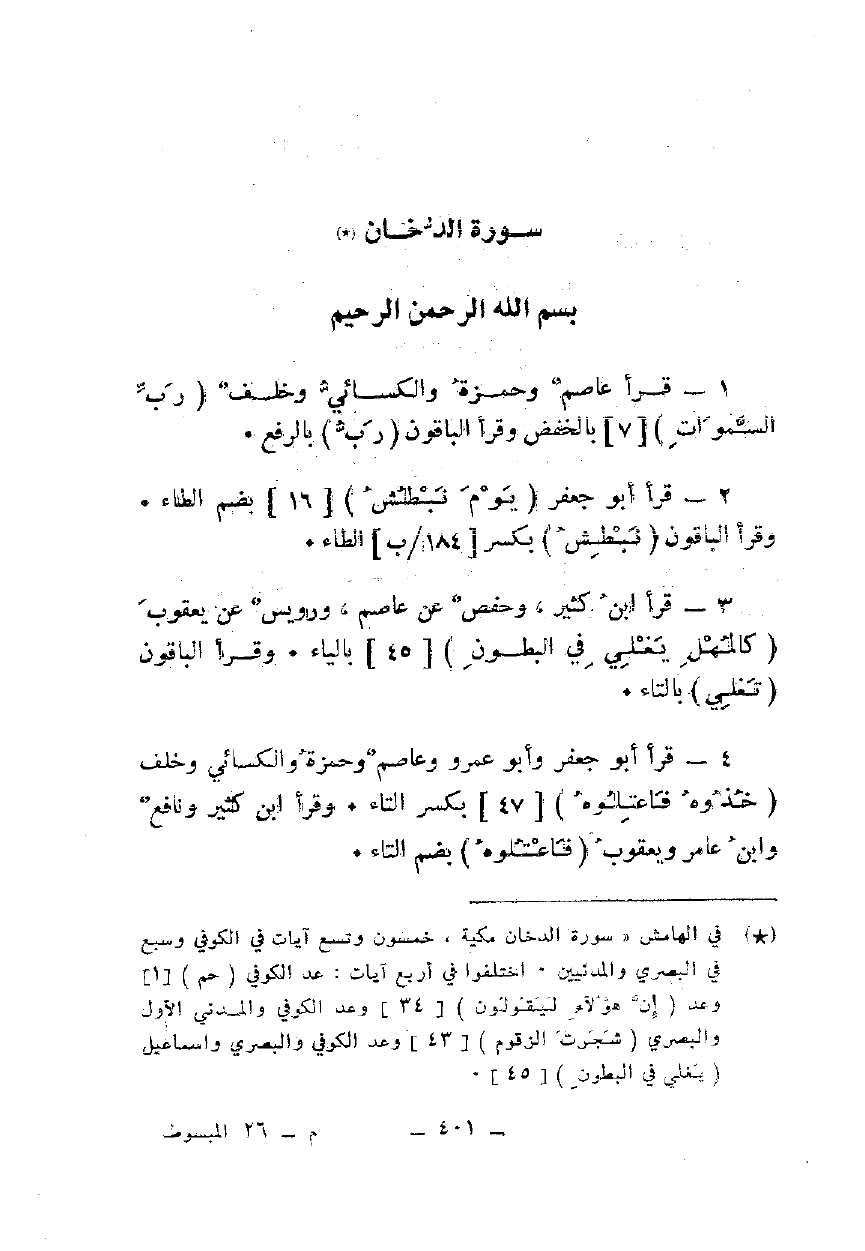 3 - قرأ ابن كثير، وحفص عن عاصم، ورويس عن يعقوب {كَالْمُهْلِ يَغْلِي فِي الْبُطُونِ} [45] بالياءز وقرأ الباقون {يَغْلِي} بالتاء.