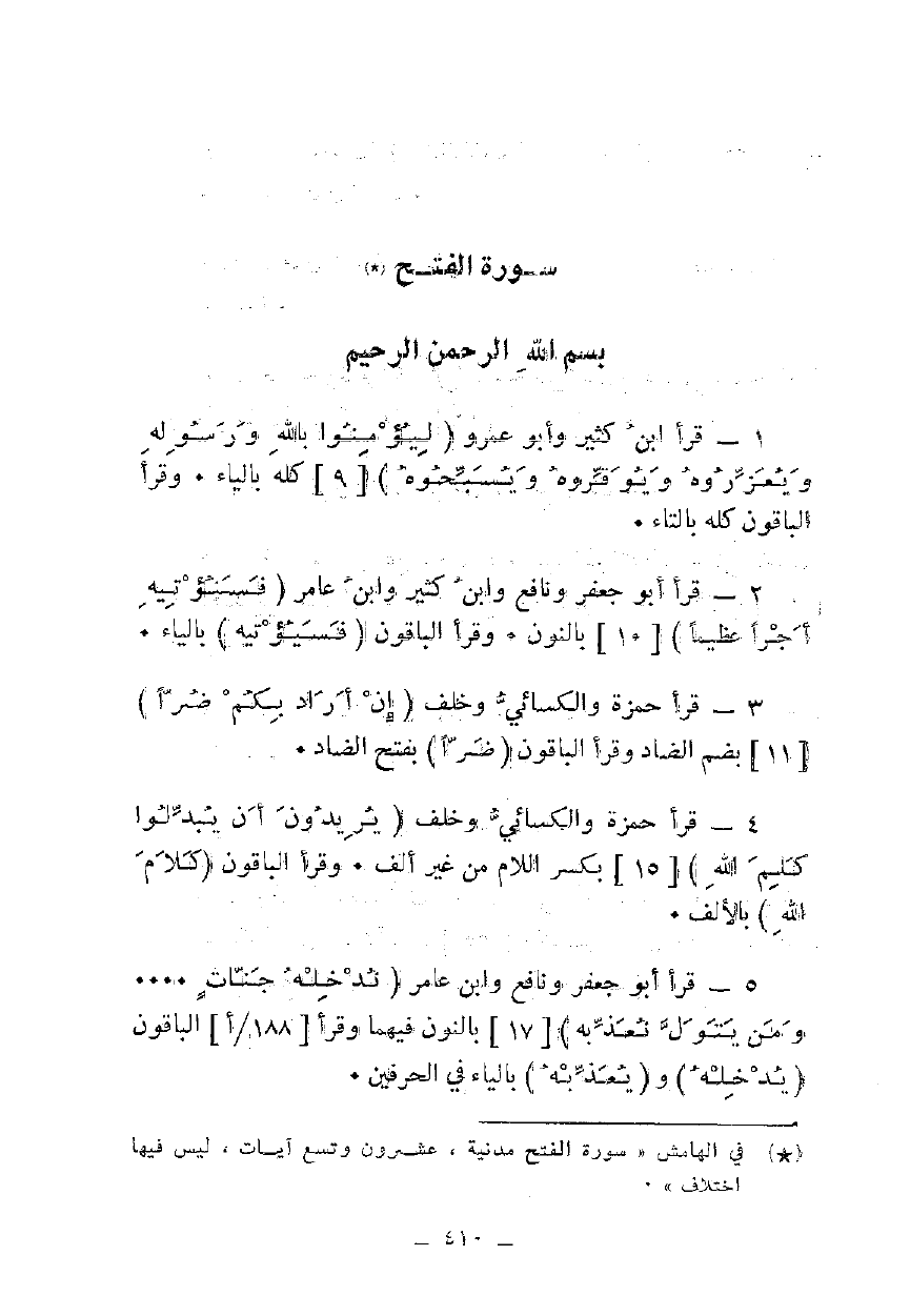 5 - قرأ أبو جعفر ونافع وابن عامر {يُدْخِلْهُ جَنَّاتٍ تَجْرِي مِنْ تَحْتِهَا الْأَنْهَارُ وَمَنْ يَتَوَلَّ يُعَذِّبْهُ} [17] بالنون فيهما وقرأ الباقون {يُدْخِلْهُ} و {يُعَذِّبْهُ} بالياء في حرفين.