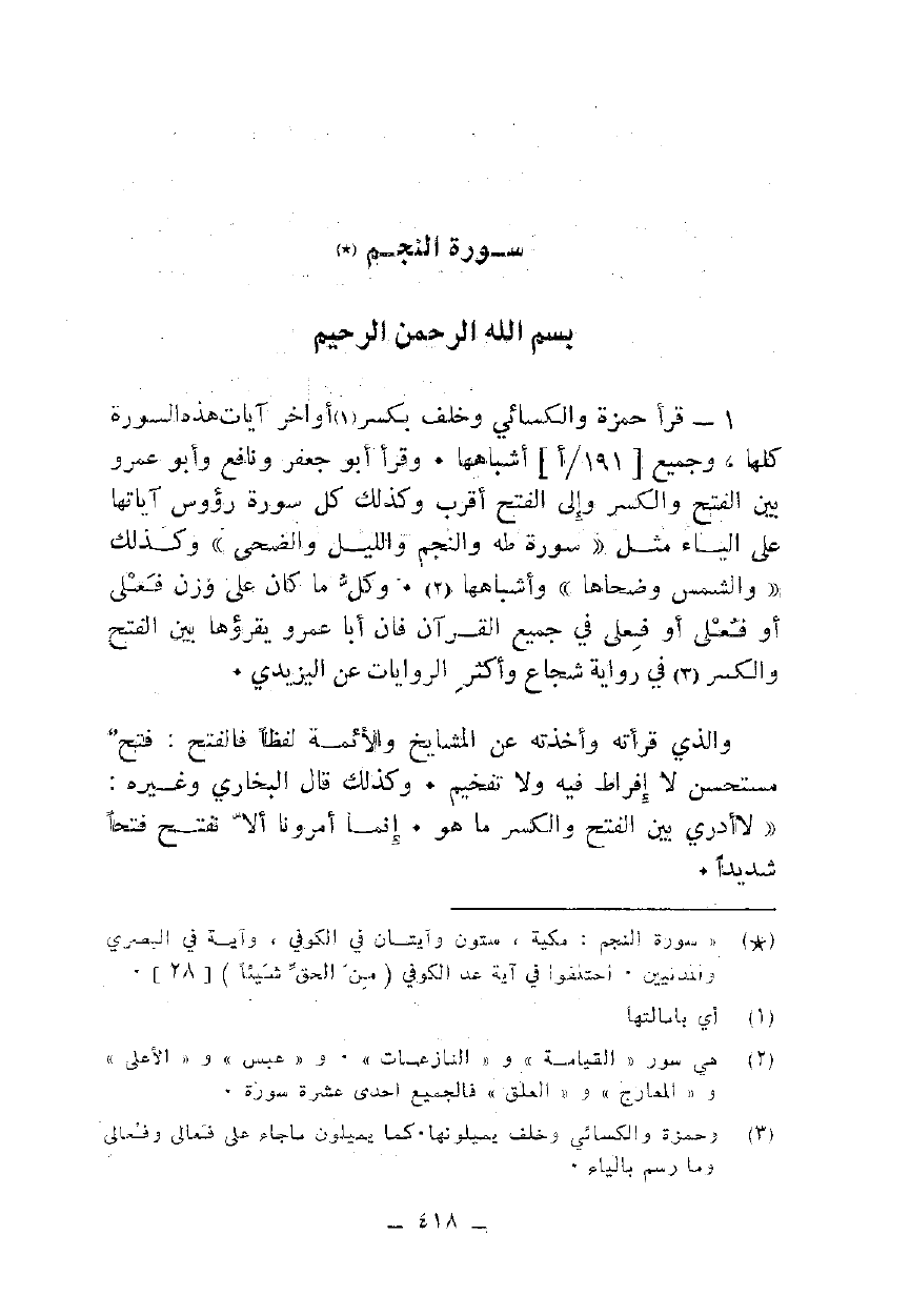 1 - قرأ حمزة والكسائي وخلف بكسر أواخر آيات هذه السورة كلها، وجميع أشباهها. وقرأ أبو جعفر ونافع وأبو عمرو بين الفتح والكسر وإلى الفتح أقرب وكذلك كل سورة رؤوس آياتها على الياء مثل "سورة طه والنجم والليل والضحى" وكذلك "والشمس وضحاها" وأشباهها. وكل ما كان على وزن فعلى أو فعلى أو فعلى في جميع القرآن فإن أبا عمرو يقرؤها بين الفتح والكسر في رواية شجاع وأكثر الروايات عن اليزيدي.