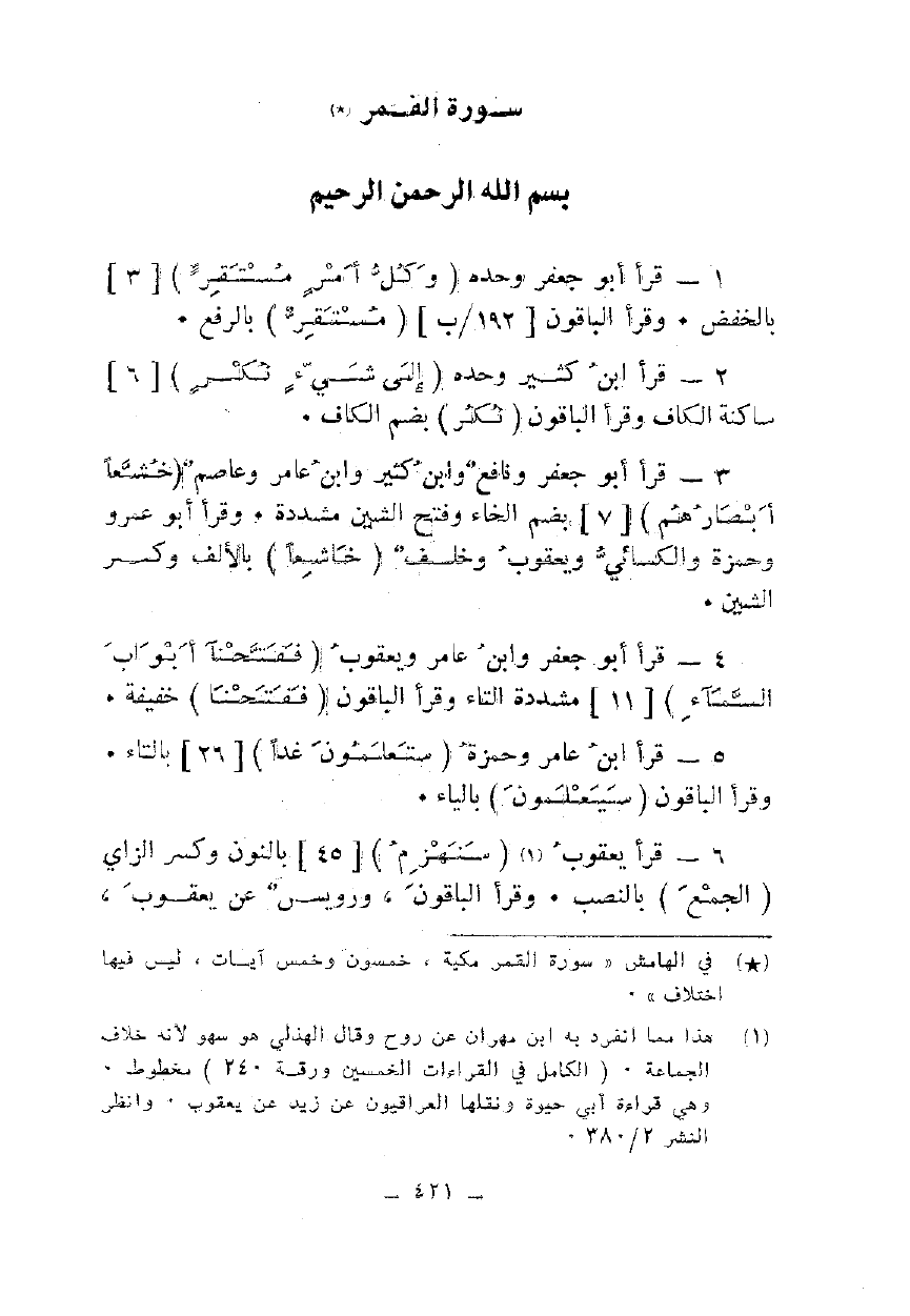 1 - قرأ أبو جعفر وحده {وَكُلُّ أَمْرٍ مُسْتَقِرٌّ} [3] بالخفض. وقرأ الباقون {مُسْتَقِرٌّ} بالرفع.