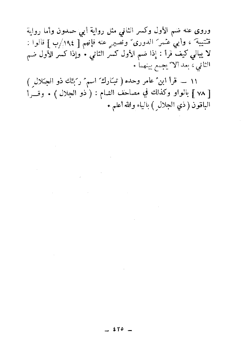 11 - قرأ ابن عامر وحده {تَبَارَكَ اسْمُ رَبِّكَ ذِي الْجَلَالِ} [78] بالواو وكذلك في مصاحف الشام: {ذِي الْجَلَالِ}. وقرأ الباقون {ذِي الْجَلَالِ} بالياء والله أعلم.
