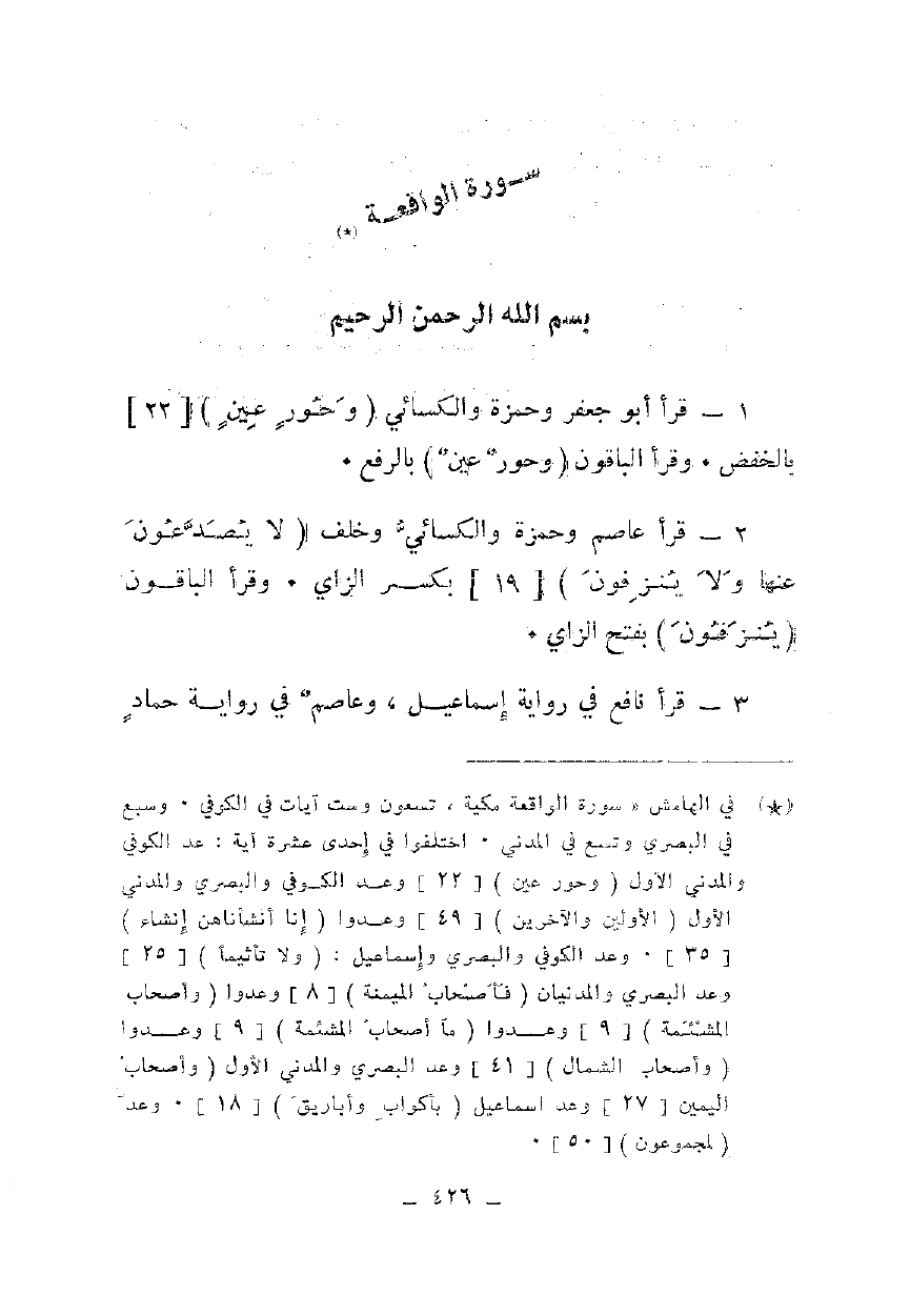 2 - قرأ عاصم وحمزة والكسائي وخلف {لَا يُصَدَّعُونَ عَنْهَا وَلَا يُنْزِفُونَ} [19] بكسر الزاي. وقرأ الباقون {يُنْزِفُونَ} بفتح الزاي.